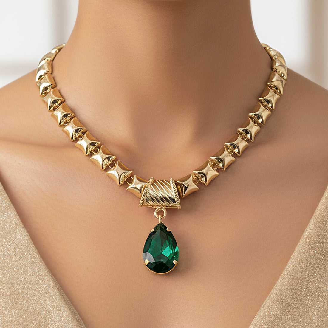 This eye-catching jewelry set includes a huge, emerald-green crystal pendant that has been meticulously carved...