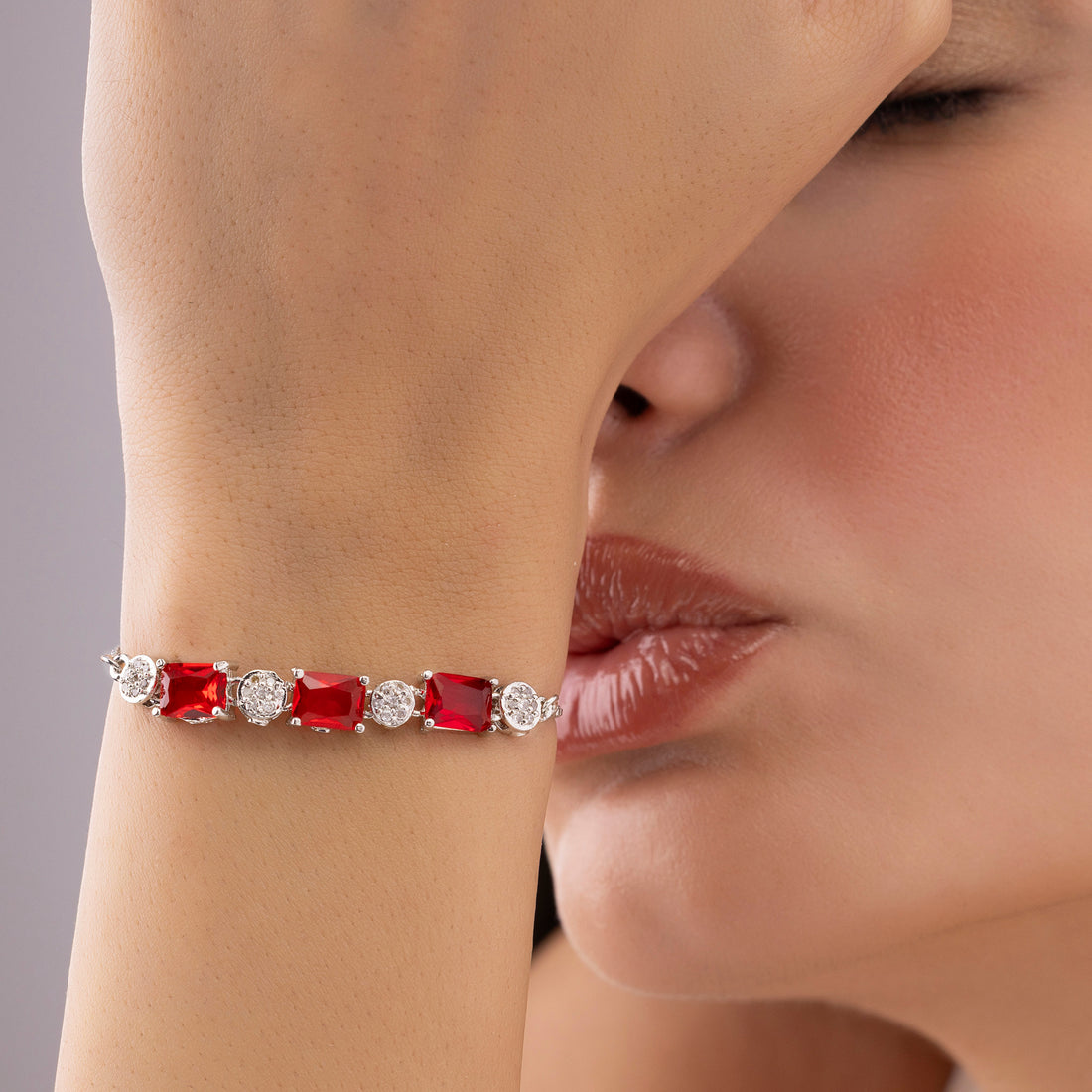 This gorgeous bracelet, with its eye-catching rectangle-shaped ruby red gems that exude charm and sophistication,...