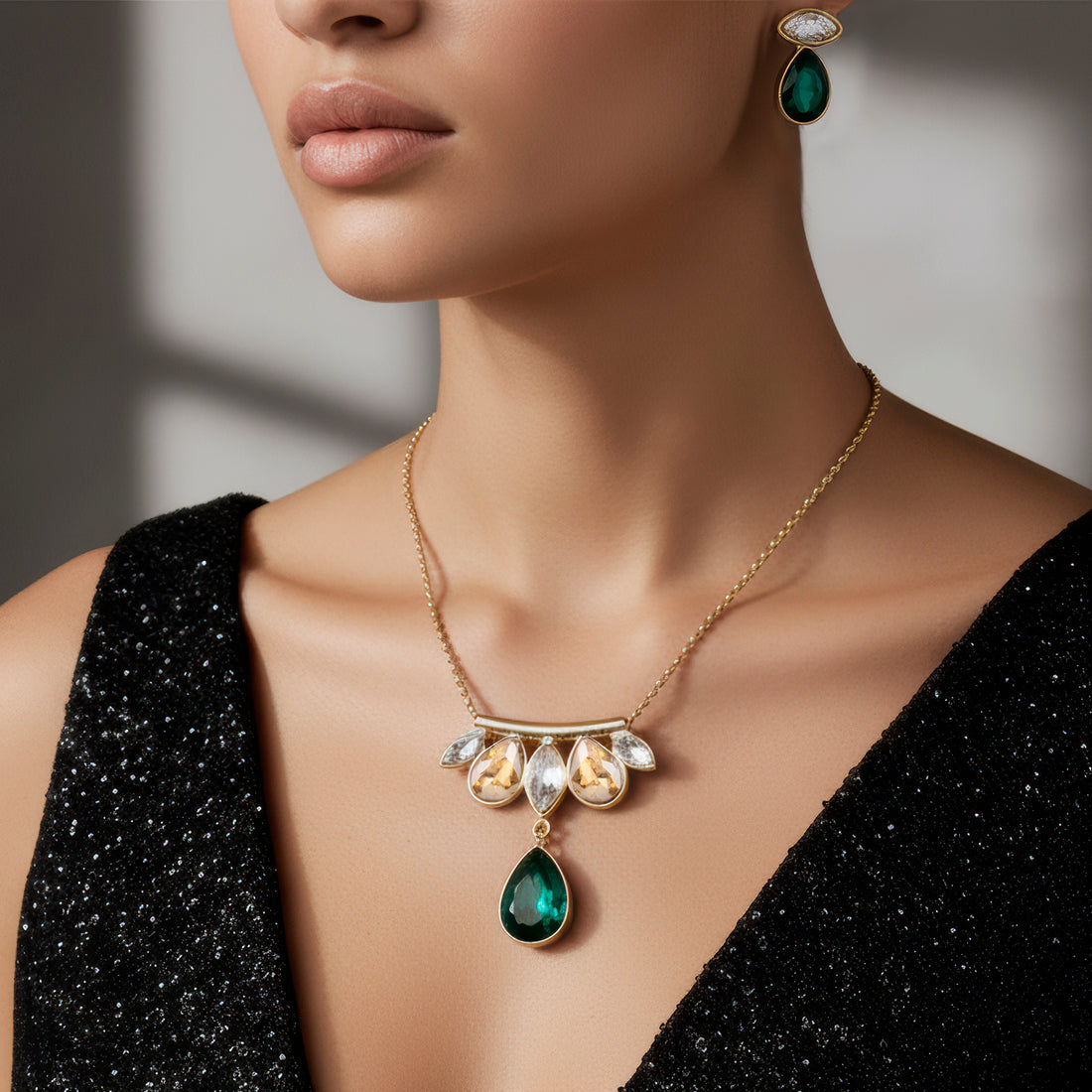 PRAO Anti-Tarnish Emerald Crystal Necklace Set With Earrings