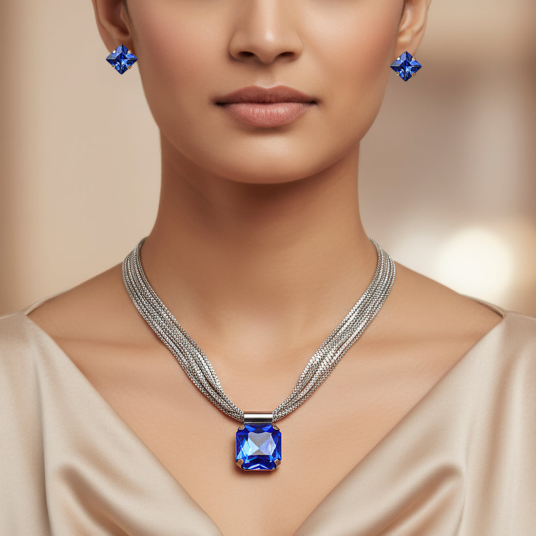 PRAO Necklace Anti-Tarnish Blue Saphhire Crystal Set With Earrings