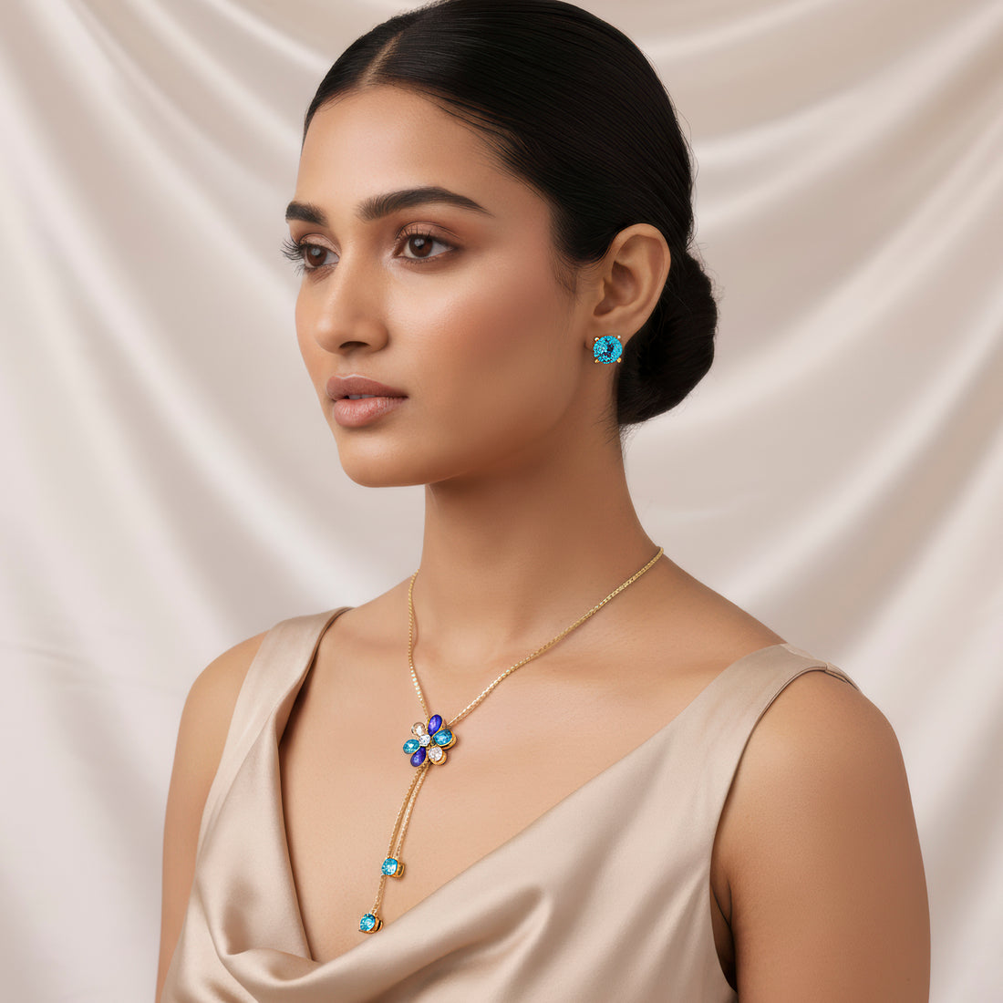 PRAO Necklace Anti-Tarnish Crystal Flower Lariat Set With Earrings