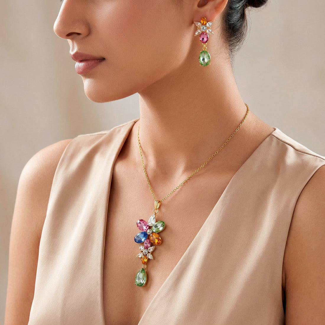 The long, graceful design of this pendant set is embellished with crystals of various hues...