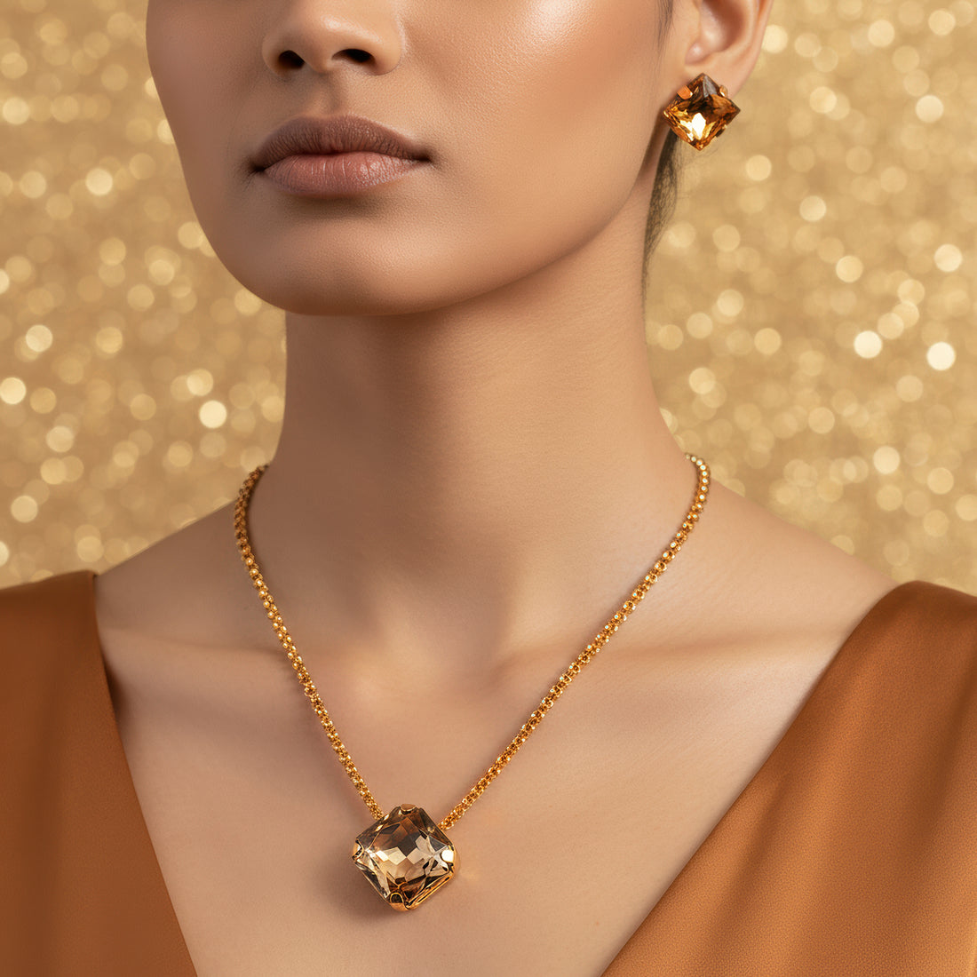 PRAO Anti-Tarnish Large Champagne Crystal Pendant Studded Necklace Set with Earrings
