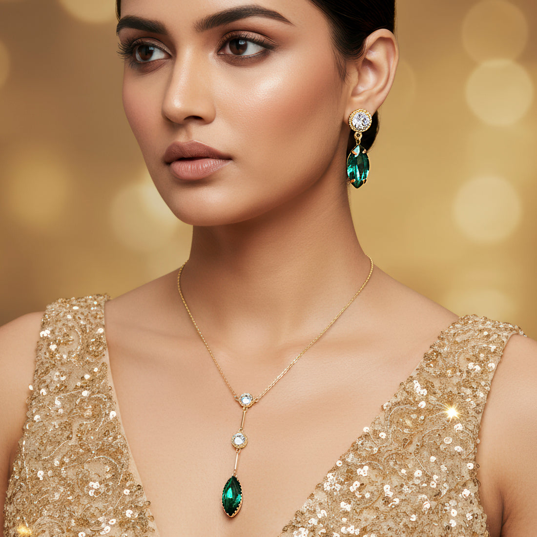 PRAO Anti-Tarnish Emerald Gold Plated Crystal Necklace Set With Earrings