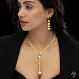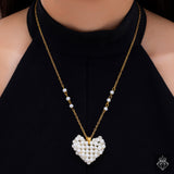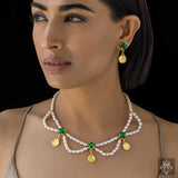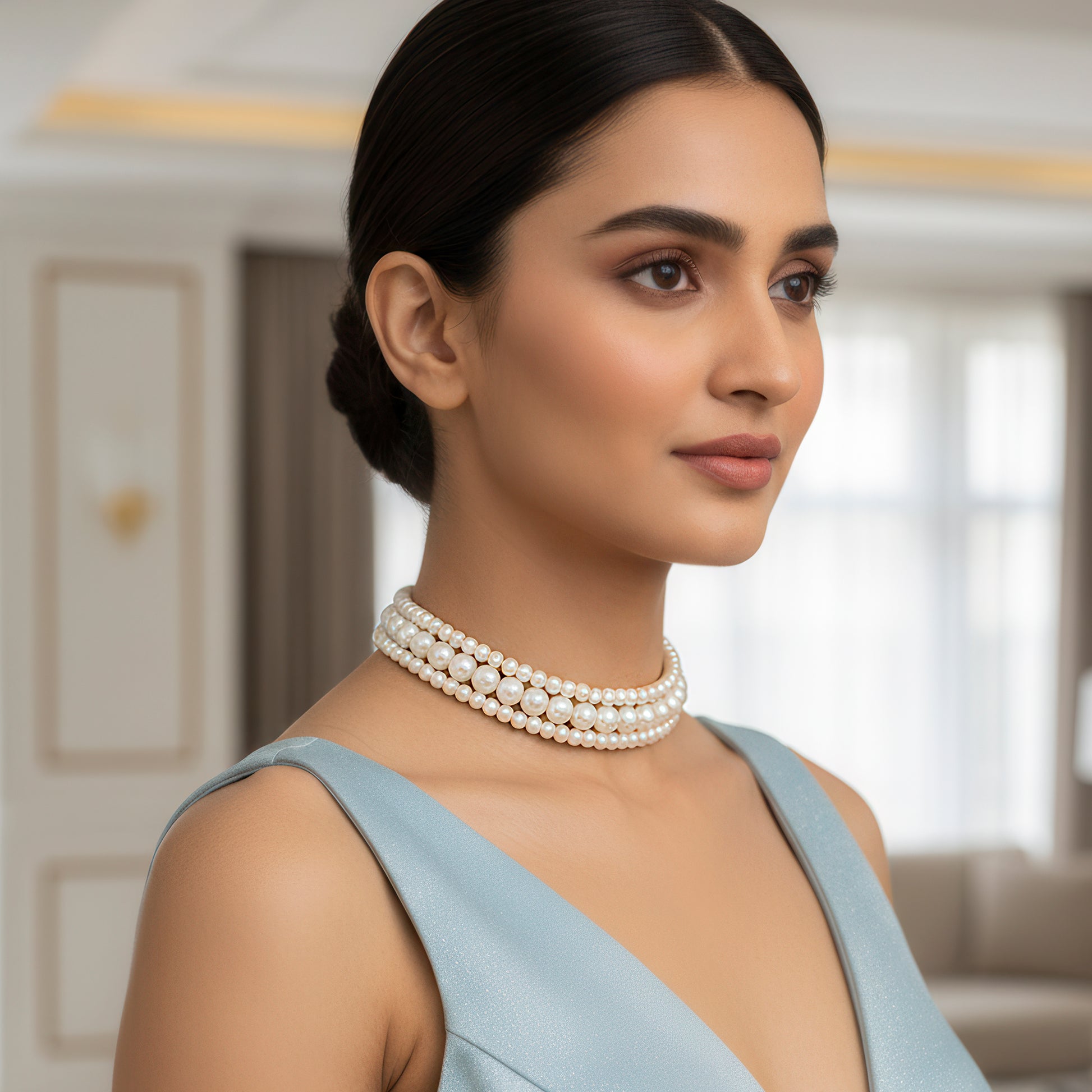 The PRAO Choker is a gorgeous piece of jewelry that skillfully combines contemporary elegance and sophistication. This choker necklace was painstakingly crafted, with lustrous pearls and tiny metal embellishments alternating to create a harmonic blend of classic elegance and modern flair. The pearls which are prized for their flawless quality and iridescent brightness are hand-picked to add a stunning glow to the neckline. Each pearl is painstakingly chosen by hand and skillfully strung together to create a gorgeous choker design that oozes sophistication and luxury.