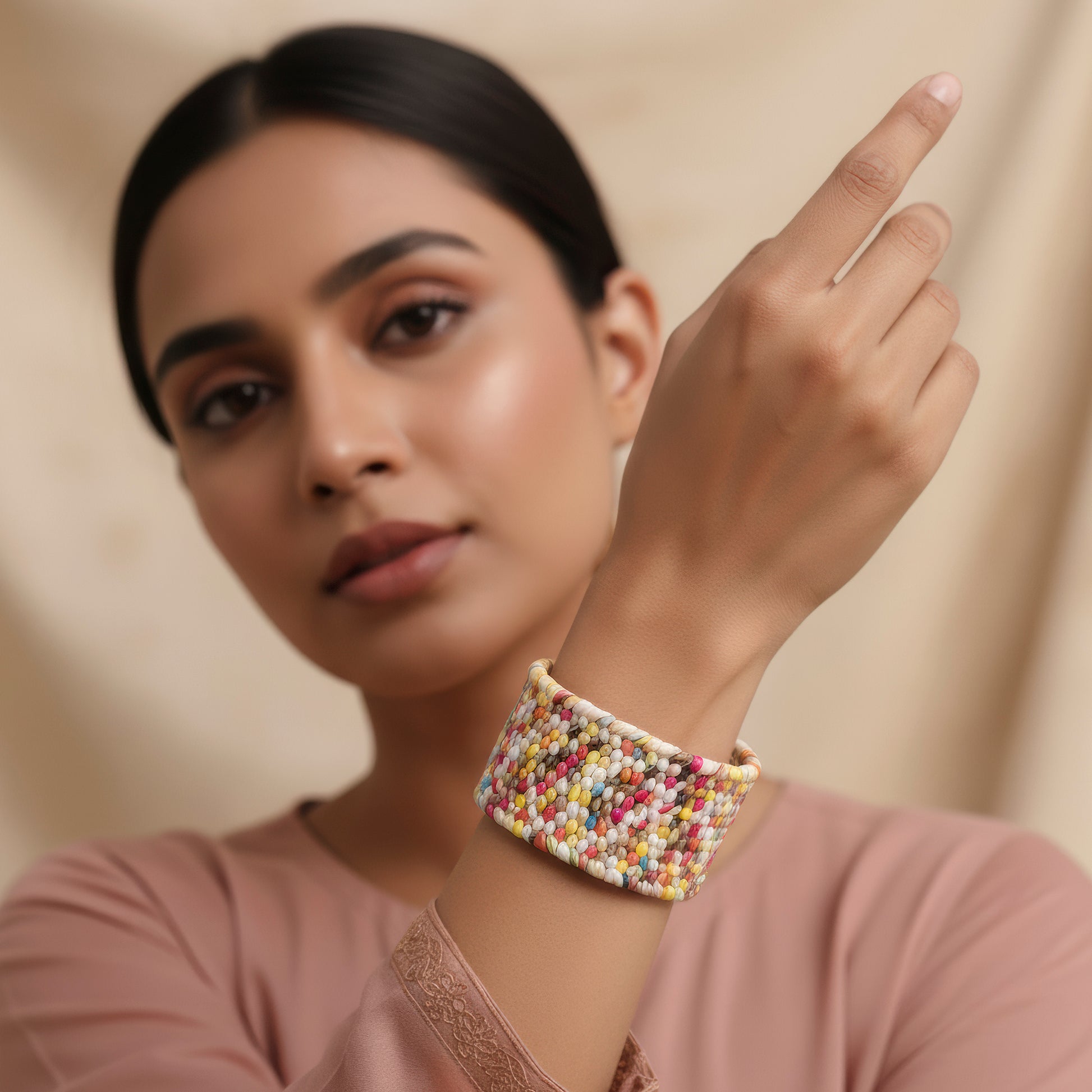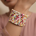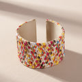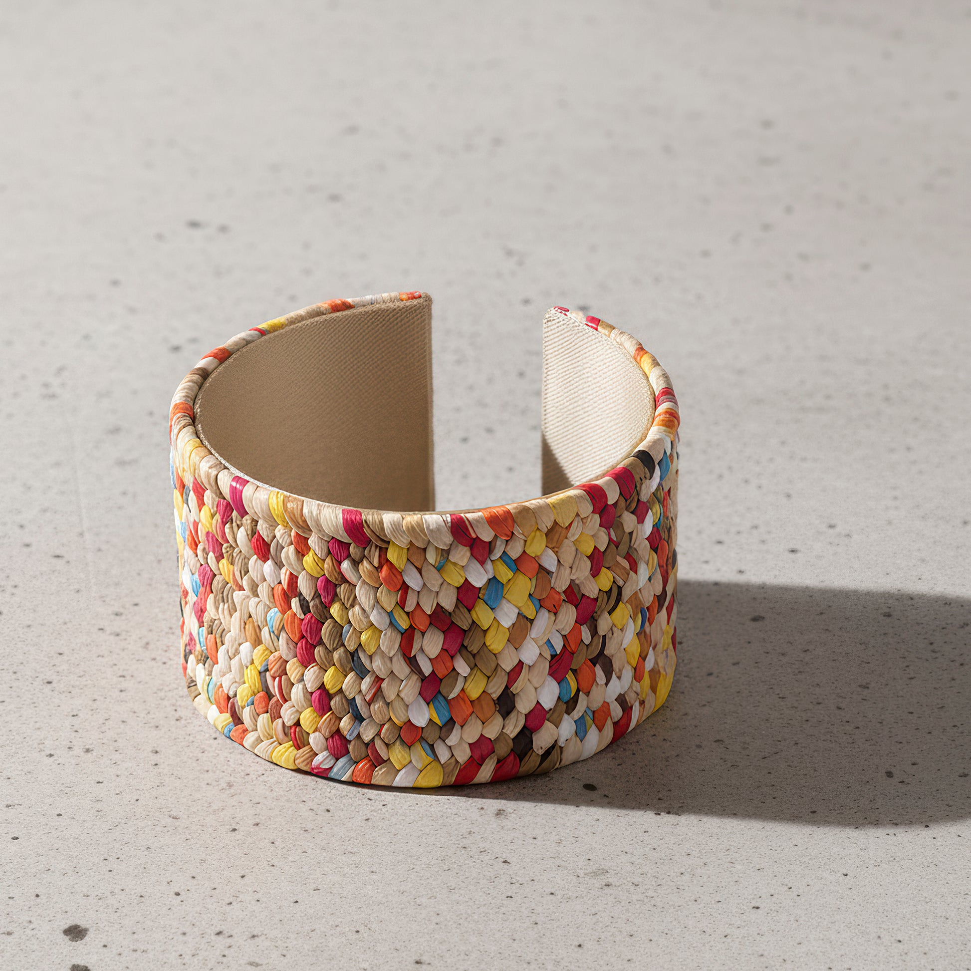 The multi-color woven Reffia cuff bangle is a vibrant bracelet that embodies a burst of colors. This unique piece features intricate weaving techniques, combining various hues to create a striking visual appeal. The cuff bangle design ensures a comfortable fit while adding a bold statement to any outfit. Perfect for both casual and formal wear, this multi-colored bracelet can effortlessly elevate your style. Its vivid and dynamic color scheme makes it a versatile accessory for any jewelry collection.