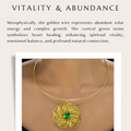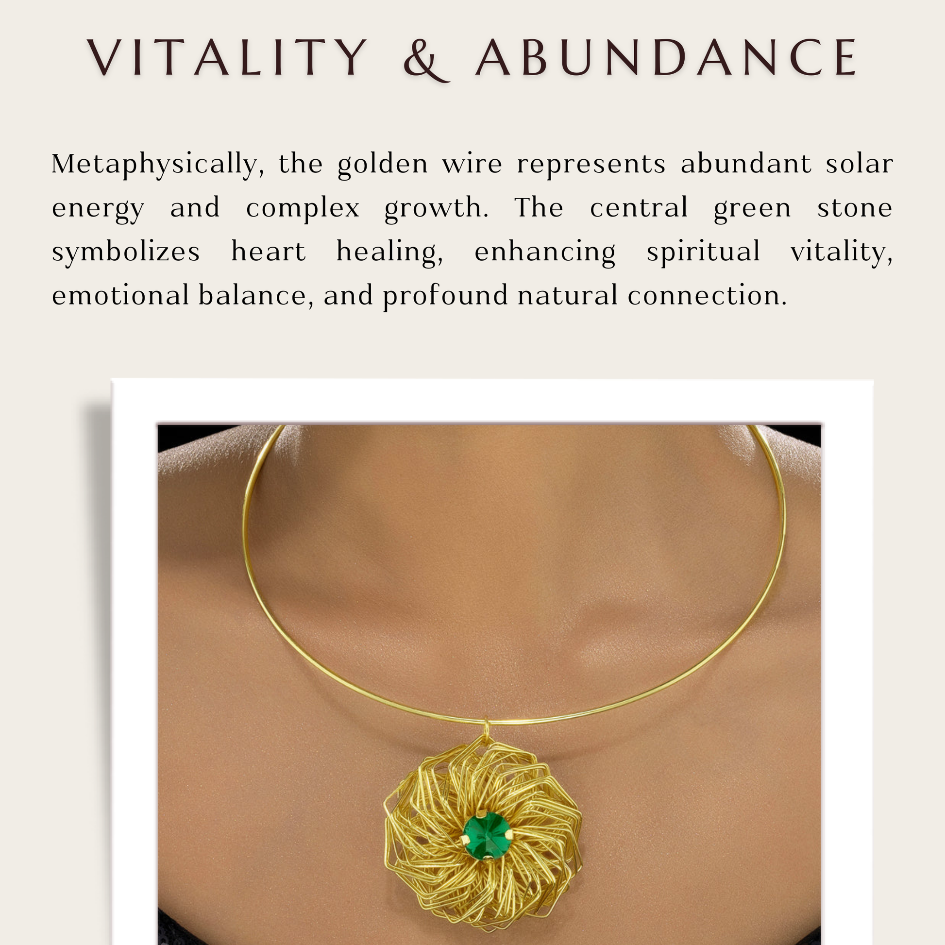 Charm radiates from this exquisite Hasli necklace, featuring a round emerald green crystal as its centerpiece. The crystal, set in a modern gold-plated frame, adds a touch of elegance and contemporary flair. Its nest-inspired design brings a unique aesthetic, blending nature with sophistication. The vibrant green hue of the crystal contrasts beautifully with the gleaming gold, creating a captivating effect. Perfect for both formal and casual wear, this necklace is versatile and chic. The circular shape of the crystal emphasizes harmony and balance. A statement piece that elevates any outfit, it’s the perfect blend of bold and graceful style.