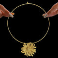 The sunflower Hasli necklace is a stunning combination of traditional workmanship and nature's beauty. This necklace, with its intricate sunflower pendant, represents enthusiasm and positivity, making it ideal for any occasion. The Hasli-style design has a dramatic and structured appearance, with a smooth, curving metal band that gracefully wraps around the neck. The sunflower centerpiece adds softness and charm, while the necklace's strong construction ensures long-term wear. The adjustable closure ensures a comfortable fit for everyone. Whether you're dressing up for an evening event or adding a standout item to your everyday appearance, this necklace looks great with any clothing. It's a gorgeous blend of elegance and nature that will last a lifetime in your jewelry collection.