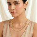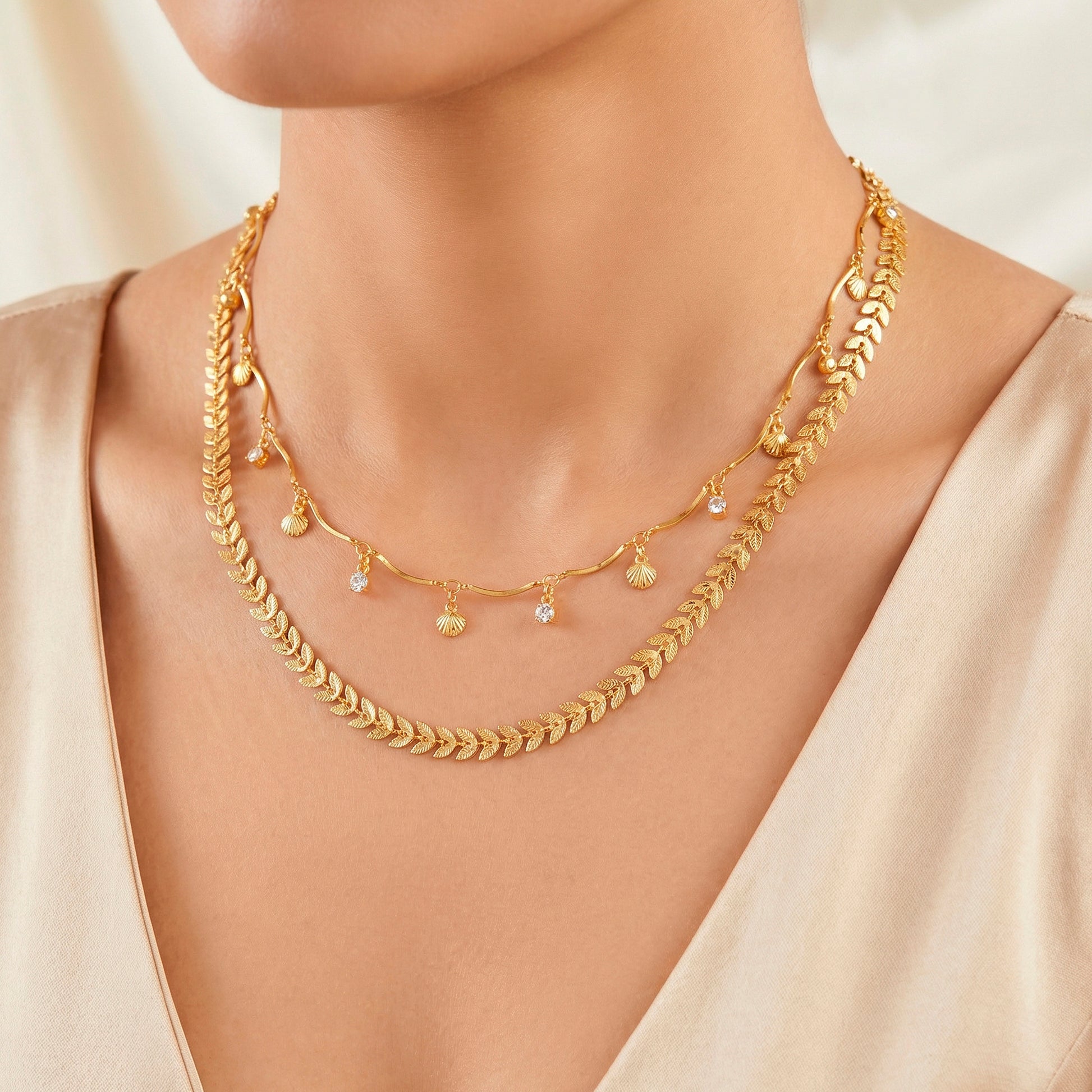 Elevate your look with this gorgeous double-layer chevron chain necklace embellished with tiny shell charms. The chevron design is sleek and sophisticated, with layered chains adding depth and refinement. Each shell charm provides a natural, bohemian touch, contrasting the harsh geometry of the chevron with a soft, organic feel. This lightweight yet robust piece can be easily combined with both casual and formal ensembles, making it an essential accessory for any event. The delicate layering lends the necklace a sophisticated yet whimsical appearance, ideal for individuals who enjoy mixing modern minimalism with a touch of nature. Whether worn alone or combined with other pieces, this necklace brings a tasteful, understated elegance to your wardrobe.