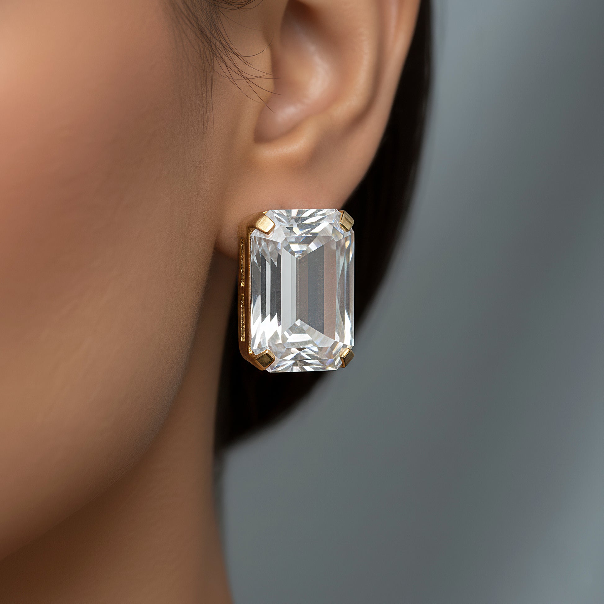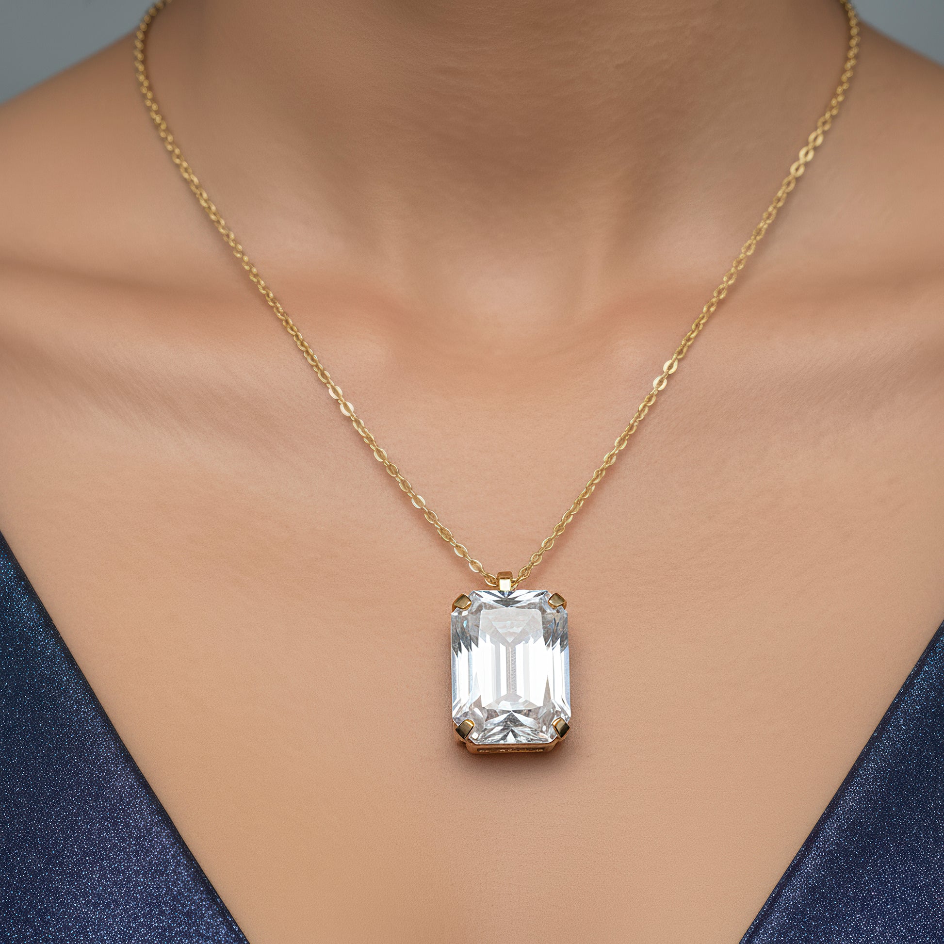 This elegant necklace set features a stunning, huge emerald-green crystal pendant that is finely faceted to catch the light and display a rich, intriguing color. Suspended from a sleek, minimalist chain, the pendant is framed by brilliant clear crystals, adding to its sumptuous appeal. The matching earrings reflect the pendant's emerald and crystal accents, resulting in a balanced, harmonious design that elevates any ensemble. This set's ideal balance of vibrant color and classic luster makes it suitable for both formal events and smart everyday wear. The necklace and earrings are meticulously crafted to create a pleasant, lightweight feel, while their timeless style assures they will be a mainstay in your jewelry collection for many years to come.