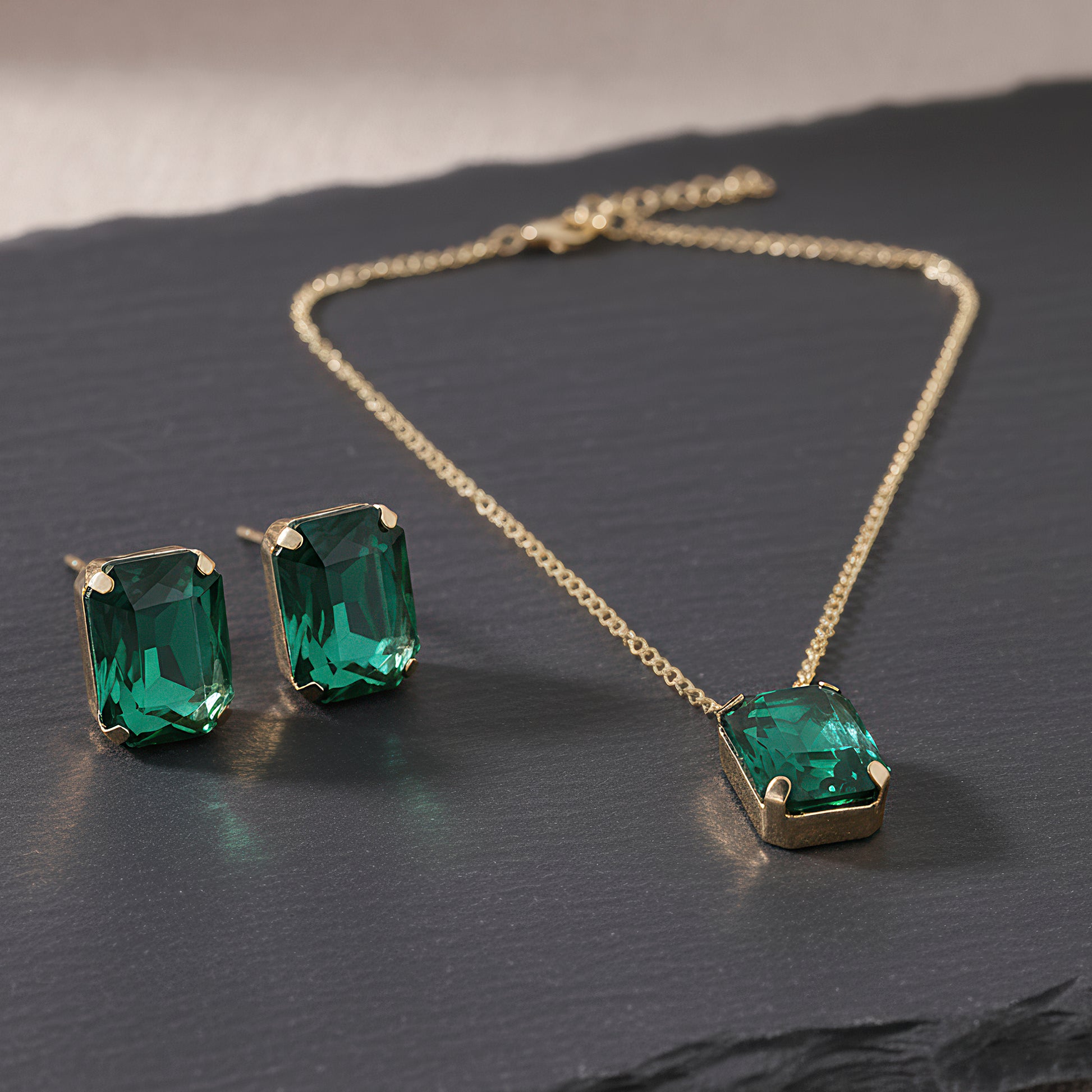 This eye-catching jewelry set includes a huge, emerald-green crystal pendant that has been meticulously carved to show off a rich, stunning color that exudes luxury. The pendant is gracefully framed by tiny clear crystals, which highlight its brilliant green color and provide a touch of glitter to the overall design. The pendant, suspended from a fine, beautiful chain, stands out due to its rich, polished quality. The earrings follow the pendant's refined style, with a stunning emerald-green gem framed by delicate embellishments to finish the look. This combination is ideal for both special events and adding a splash of color to regular outfits, as it provides lightweight comfort and timeless charm. It's a striking piece that effortlessly adds beauty to any look.