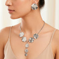 This exquisite necklace set boasts a unique Y-coin pattern that exudes modern sophistication. The necklace features a slim chain and a stunning Y-shaped pendant embellished with glittering coins that catch the light brilliantly. Crafted from high-quality silver, this set has a classic sheen that complements every attire. The complementary earrings complement the Y-coin motif, resulting in a sophisticated and flexible style. This combination is suitable for every occasion, from casual parties to formal events, and may be worn alone or as a layer. The sturdy clasp guarantees a snug fit and easy wear throughout the day. Whether for yourself or a loved one, this Y-coin necklace set is a stylish addition to any jewelry collection, celebrating both elegance and contemporary style.