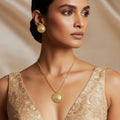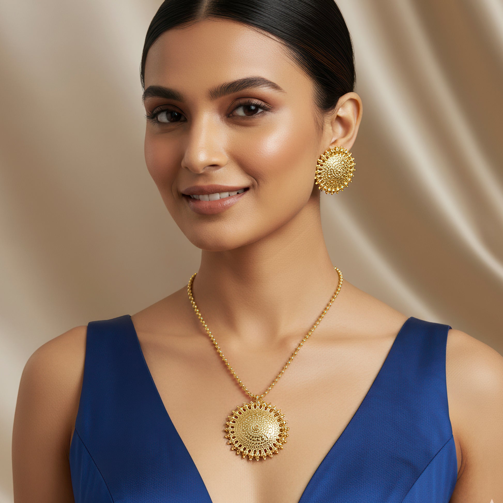 This magnificent ethnic jewelry set has a dazzling sun-inspired design that is intricately designed to create a sense of warmth and energy. The combination comprises a stunningly designed necklace and matching earrings, both embellished with vibrant sun patterns. A sleek ball chain completes the look, giving it a modern twist on the traditional ethnic style. The combination of rich materials and the bright sun emblem makes a bold statement suitable for both casual and celebratory situations. The lightweight and comfortable shape allows for easy wear, while the sun theme's timeless appeal makes it a flexible addition to any collection. This set is appropriate for those who value a mix of cultural heritage and contemporary style, making it an excellent choice for enhancing any look.