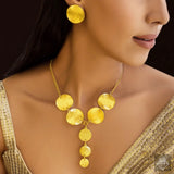 This lovely jewelry set includes a beautifully designed necklace and matching earrings, both inspired by graceful leaf designs. The delicate workmanship gives a touch of natural charm, making this set ideal for dressing up your everyday ensembles or adding refinement to festive and special occasions. The lightweight design provides comfort throughout extended wear, while the high-quality craftsmanship ensures durability and a long-lasting shine. The necklace hangs beautifully around your neck, accentuating your collarbone, and the matching earrings complete the look. This set is versatile and attractive, and it looks great with both ethnic dress-like sarees and lehengas and contemporary ensembles. This jewelry set is ideal for gifting or pampering oneself, as it seamlessly blends timeless elegance with modern appeal.