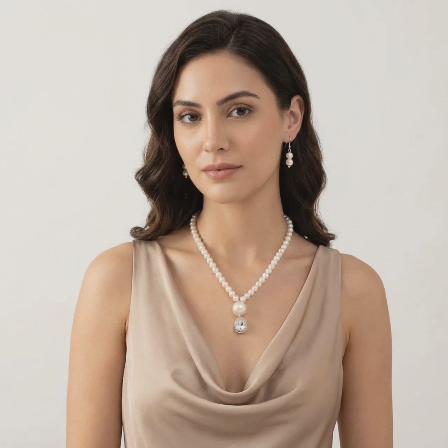 This beautiful jewelry set includes a magnificent pearl necklace and matching earrings, which ooze classic sophistication. The necklace is embellished with bright pearls that exude grace and beauty, making it suitable for formal occasions, parties, and even everyday use. The earrings are the perfect accompaniment to the necklace, providing a harmonic and professional style. Made of high-quality fabrics, this outfit is lightweight, long-lasting, and pleasant to wear all day. Its adaptable design allows it to easily mix with a wide range of clothes, from classic to modern, providing a sophisticated touch to any look. Whether as a thoughtful gift or a fashionable addition to your collection, this pearl set represents subtle beauty and charm.
