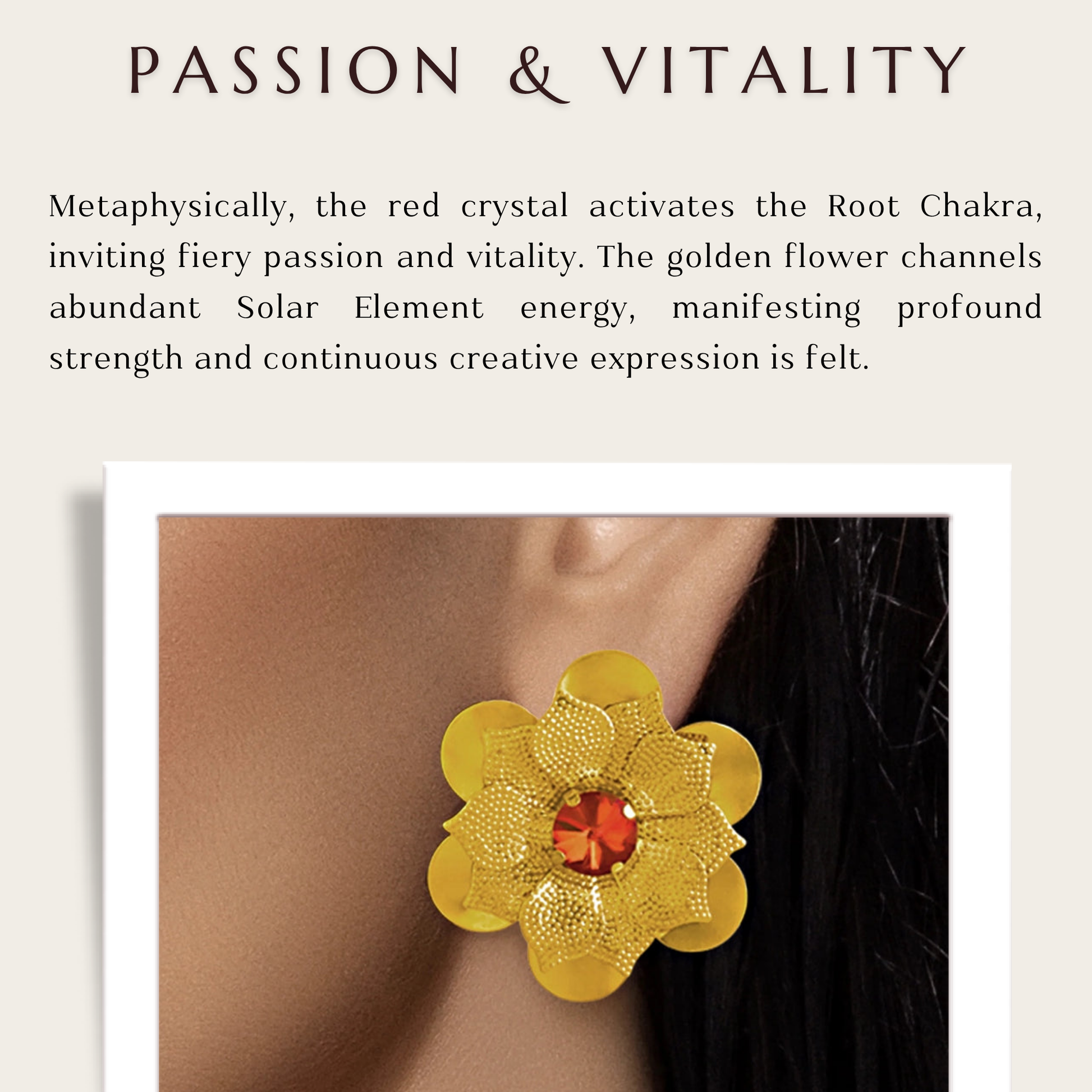 These stunning flower earrings have a lovely pattern that is accented with brilliant red crystals, adding a flash of color and elegance. The delicate floral shape is both timeless and sophisticated, with each red crystal expertly placed to optimize its brilliance and produce a stunning visual effect. The deep crimson color contrasts well with the exquisite detailing of the petals, making these earrings the ideal standout item for any event. Whether dressing up for a formal event or adding a touch of refinement to casual attire, these earrings elegantly boost any outfit. They are designed for comfort and fashioned with care to detail, providing both durability and long-lasting beauty, making them an ideal addition to any jewelry collection.