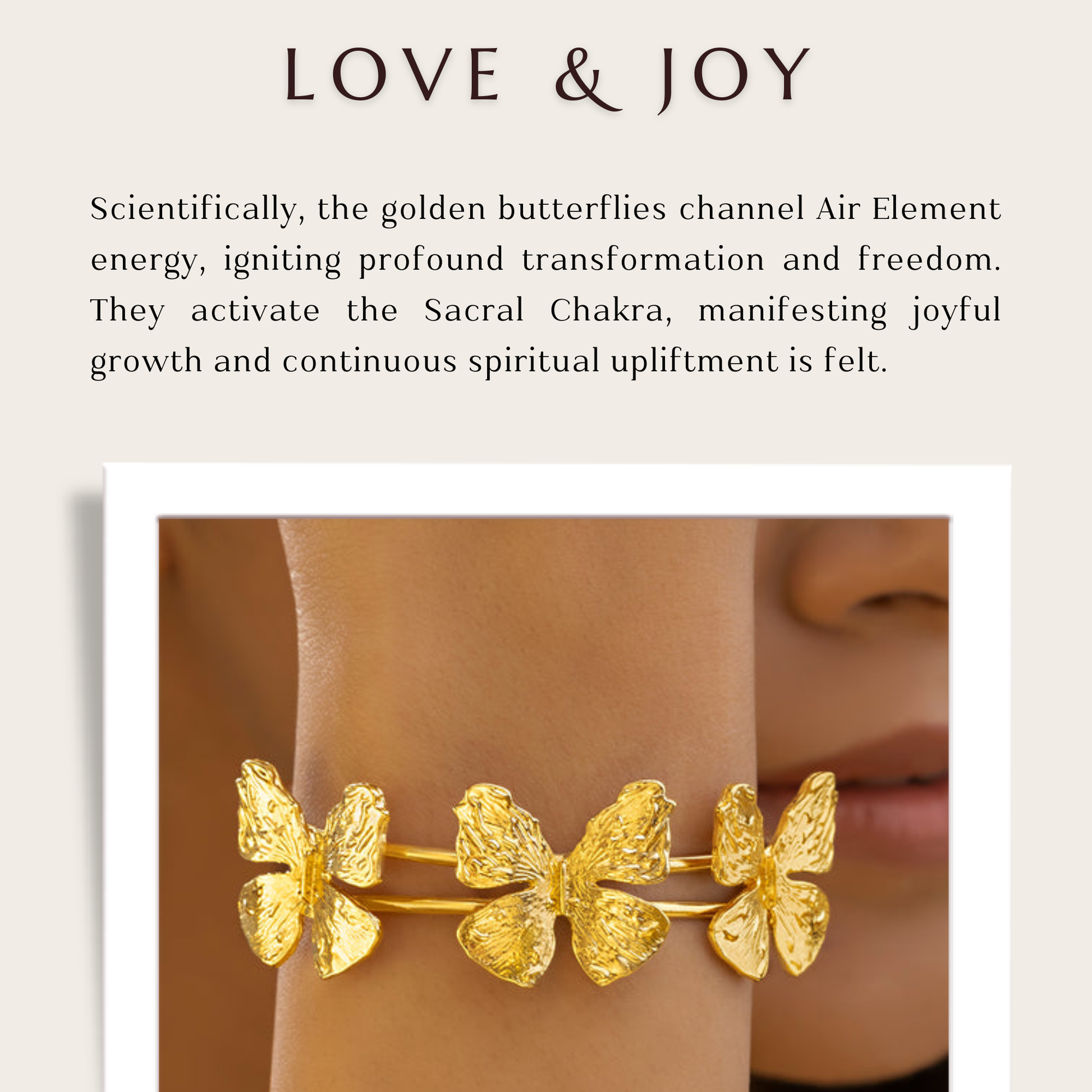 This lovely bangle bracelet features a trio of wonderfully made butterfly designs that represent elegance and metamorphosis. The butterflies are gracefully positioned throughout the sleek bangle, with subtle features that add movement and charm to the design. A polished finish gives it a brilliant luster, highlighting the delicate craftsmanship and making it a striking accessory. The bracelet is designed for comfort, with a lightweight yet sturdy construction that allows it to sit effortlessly on the wrist. Its timeless and versatile design makes it suitable for both casual and formal wear, whether worn alone for a minimalist look or stacked with other bracelets for a trendy style. This bracelet is the ideal combination of nature-inspired beauty with contemporary refinement, adding a touch of whimsy and grace to any look.