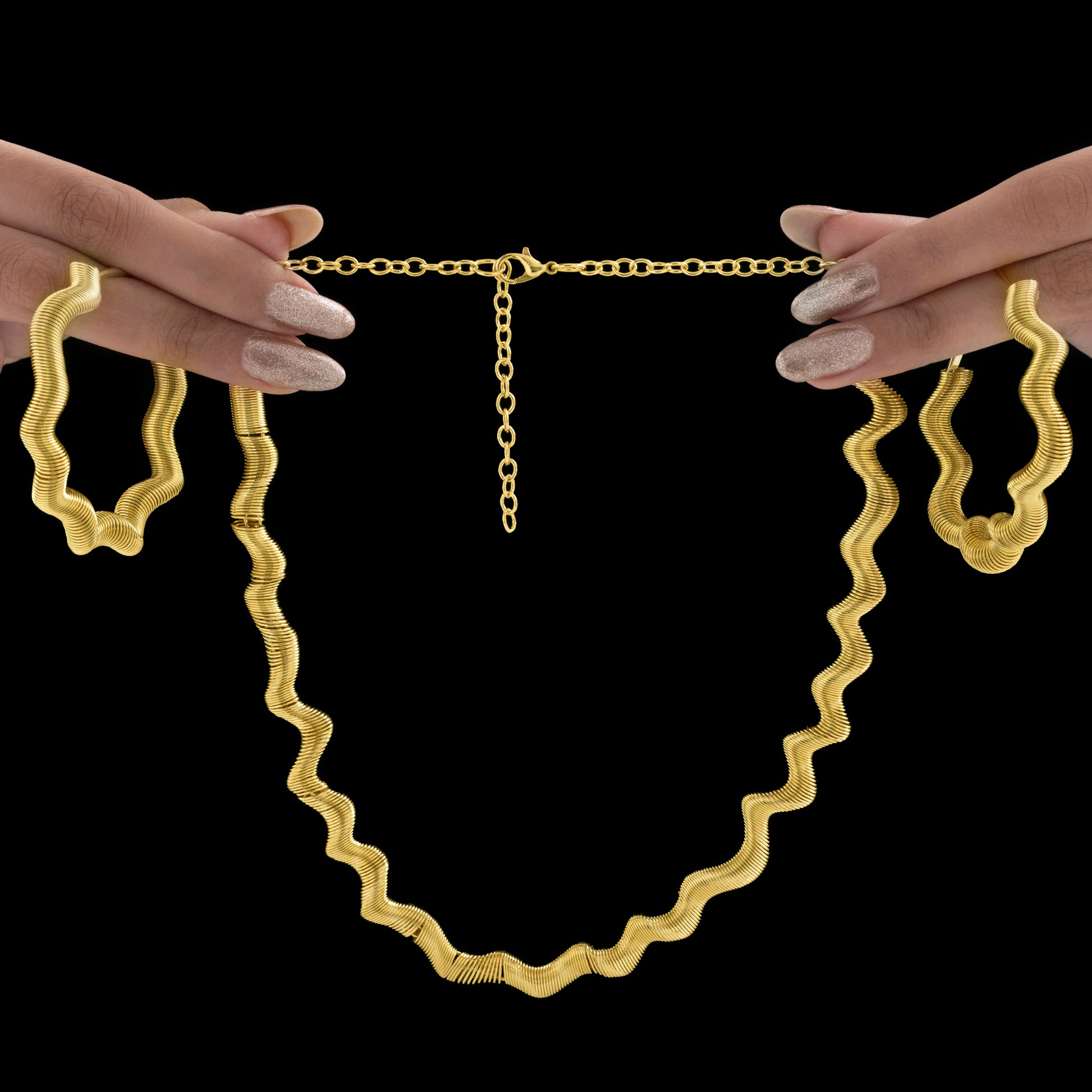 This exquisite jewelry set mixes the fluidity of spring wire with modern design components to create a captivating appearance. The necklace has a smooth, flexible spring wire that drapes gently around the neck, providing a comfortable and fashionable fit. Its slight sheen complements the clean, minimalist look, making it an adaptable accessory for both everyday and extraordinary occasions. This combination, which includes matching spring wire hoop earrings, oozes contemporary beauty. The hoops are lightweight and simply stylish, with a design that captures light with each movement. Together, the necklace and earrings form a harmonic, coordinated design that is ideal for adding a touch of polished elegance to any ensemble. This timeless set is guaranteed to be a favorite, matching a wide range of styles with ease.