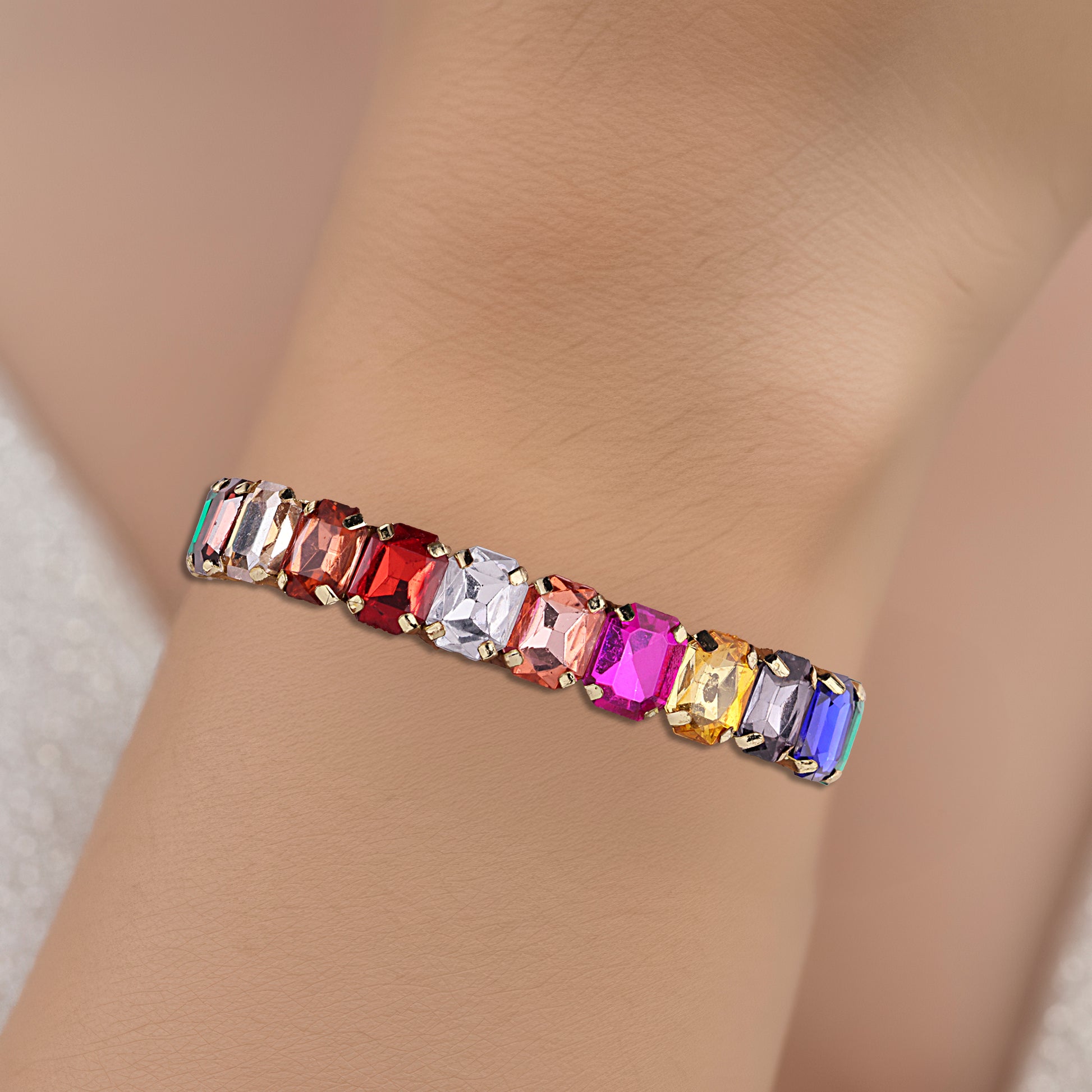 This magnificent multicolor crystal stretchable bracelet is an ideal combination of elegance and versatility. Its bright crystals in a variety of dazzling hues provide a splash of color to any ensemble. The elastic construction provides a comfortable, secure fit for all wrist sizes, making it simple to put on and take off. Whether you're getting ready for a formal event or adding a touch of sparkle to your casual outfit, this bracelet is a timeless item that complements every style. Its high-quality materials are designed to retain their luster, ensuring long-term wear. This piece, which is lightweight and easy to match with other jewelry, is excellent for giving as a present or indulging yourself. This eye-catching bracelet will add charm and sophistication to your collection.