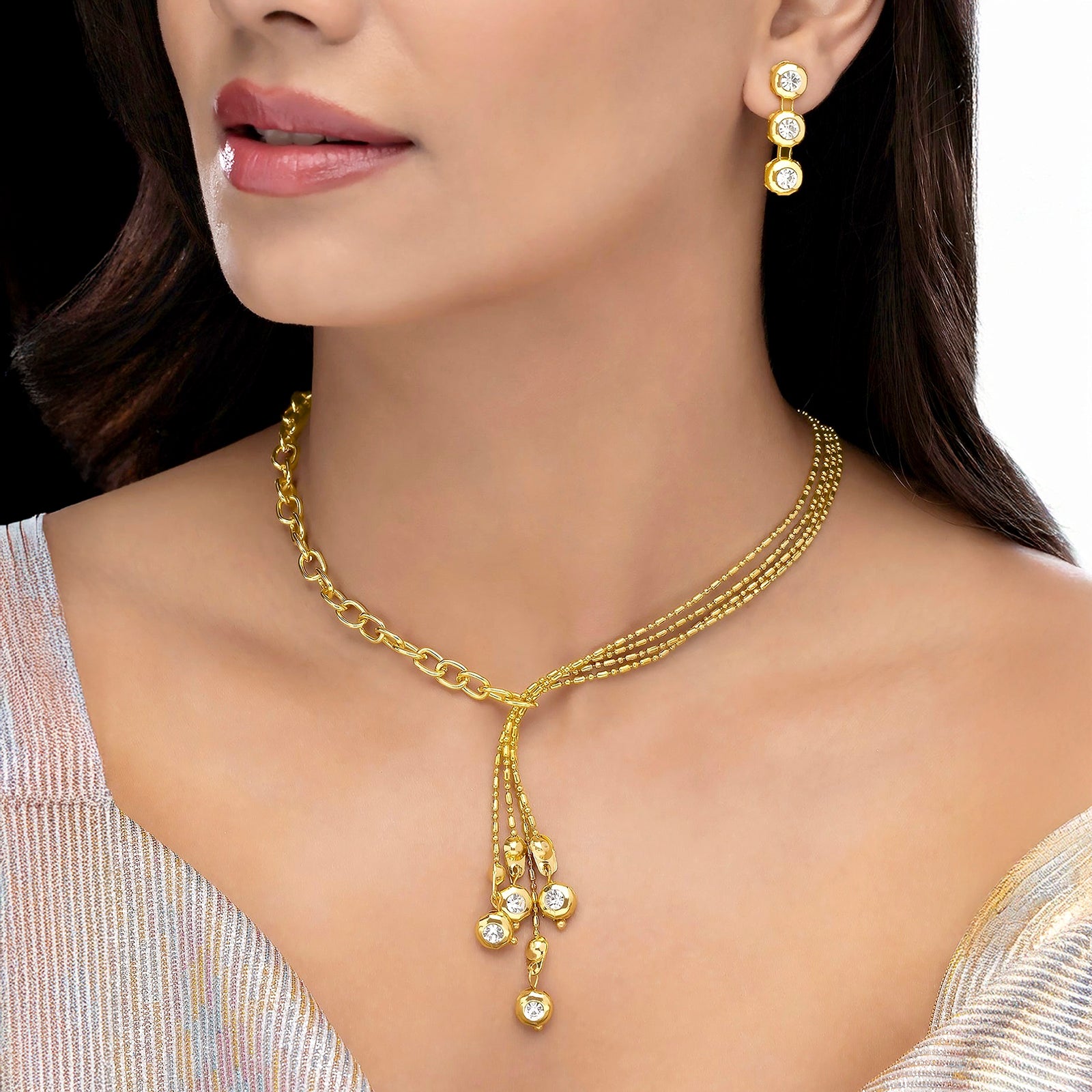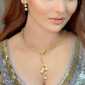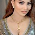 This Elegant Y-shaped necklace set, which features a sleek capsule-link chain and glittering crystal accents, will add to your elegance. The delicate yet eye-catching design creates a classy and elegant appeal as it falls elegantly along the neckline. With each movement, the glistening gems add a touch of brilliance and exquisitely capture the light. Ideal for both formal events and laid-back stylish ensembles, this piece skillfully combines classic glamor with contemporary minimalism. Complementing the necklace, the matching earrings provide a tasteful harmony of elegance and brightness. This jewelry set, which has been meticulously crafted, is a stunning option for individuals who value understated luxury. Whether worn alone or combined with additional items, this alluring set gives any ensemble a dash of elegance and brilliance.