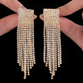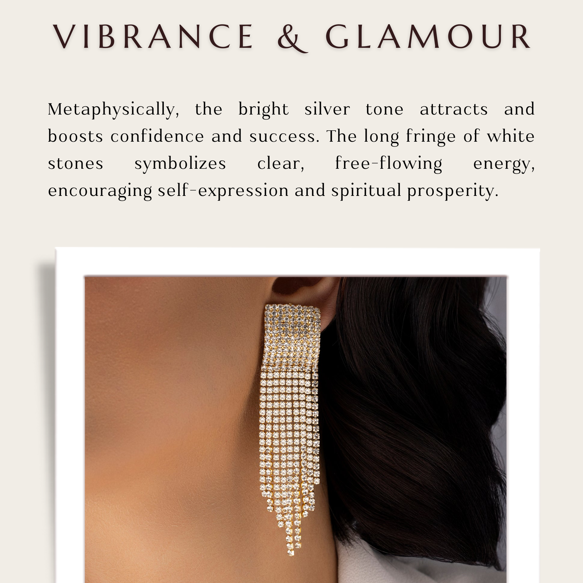 These gorgeous rhinestone tassel chain dangle earrings will make a striking fashion statement. They have a sleek, mobile-inspired design that radiates contemporary elegance with a dash of glitz. With each movement, the glittering rhinestones produce a stunning effect as they catch the light. They are the ideal accessory for evening events, parties, and special occasions because of the elegant fluidity that long, delicate tassel chains bring. These striking yet lightweight earrings add a sleek and sophisticated tone to your entire ensemble while providing comfort. They effortlessly add a bit of shine and charm to any ensemble, whether it's a chic dress, a sleek gown, or even a fashionable casual ensemble. These earrings are a must-have for any jewelry collection and are ideal for people who enjoy modern style with a touch of luxury.