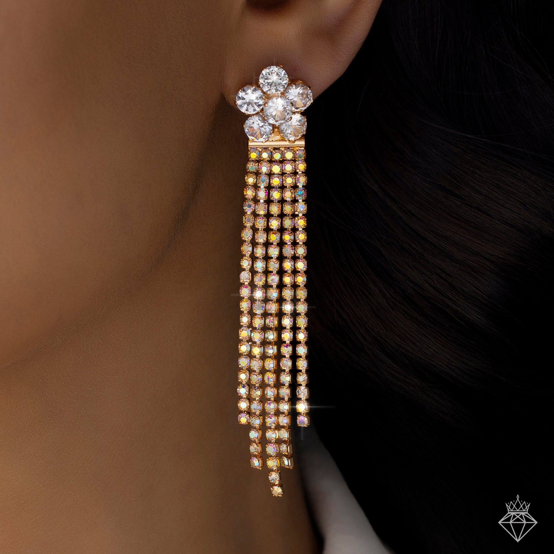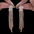 These gorgeous crystal blossom earrings with delicate rhinestone chain dangles will add a touch of elegance. A sophisticated and feminine appearance is produced by the exquisitely crafted floral studs, which dazzle exquisitely. These gorgeous earrings are made even more charming by the movement and gleam of the suspended rhinestone chains. They go well with both classic and contemporary attire, making them ideal for weddings, parties, and other special events. Comfort is guaranteed by the lightweight design, which also makes a striking impression. These earrings add a delicate yet glitzy touch to any ensemble, whether it's an evening gown, ethnic clothing, or a stylish dress. They are ideal as a gift or as a stunning addition to any jewelry collection, and they are made for people who appreciate elegant elegance with a touch of glitter.