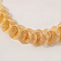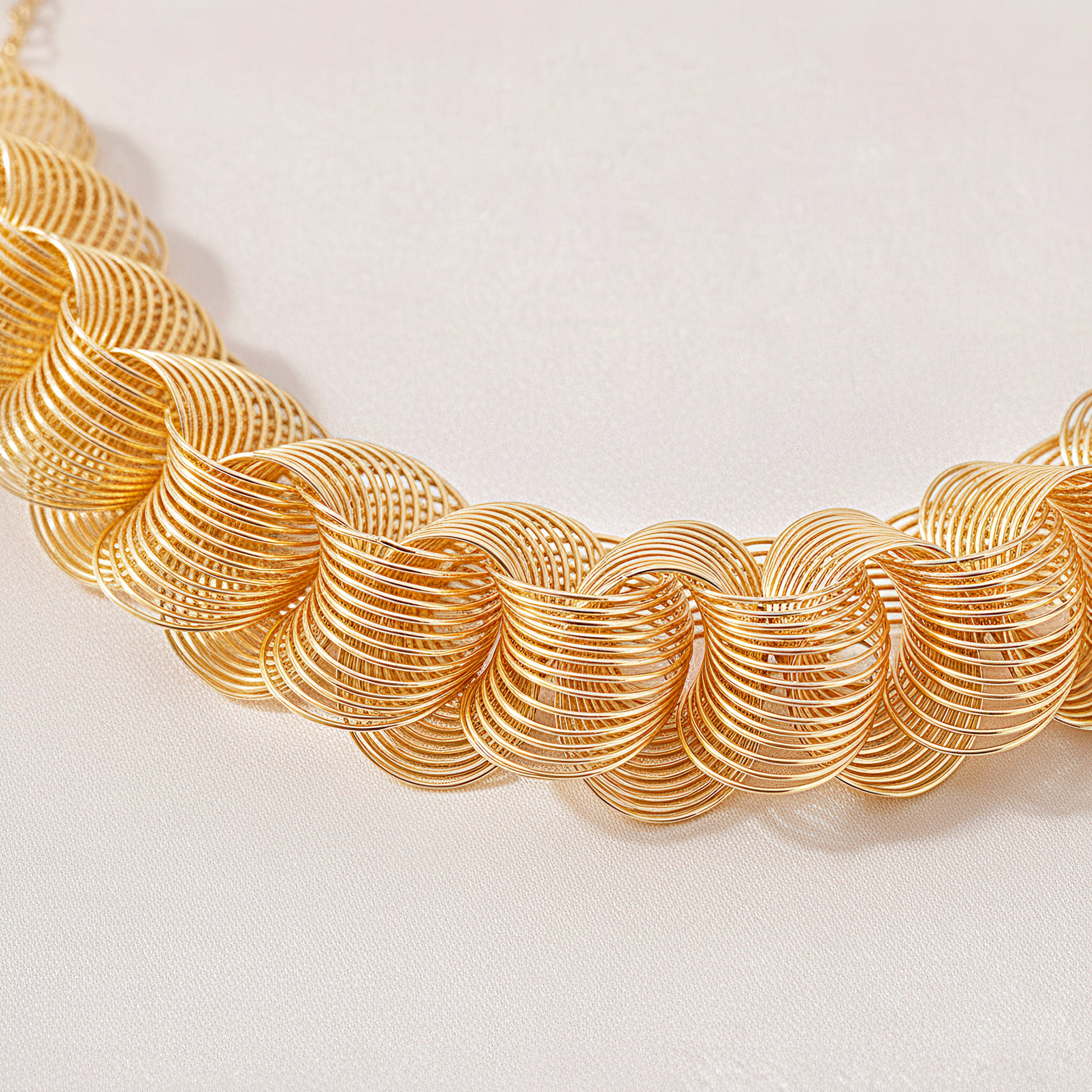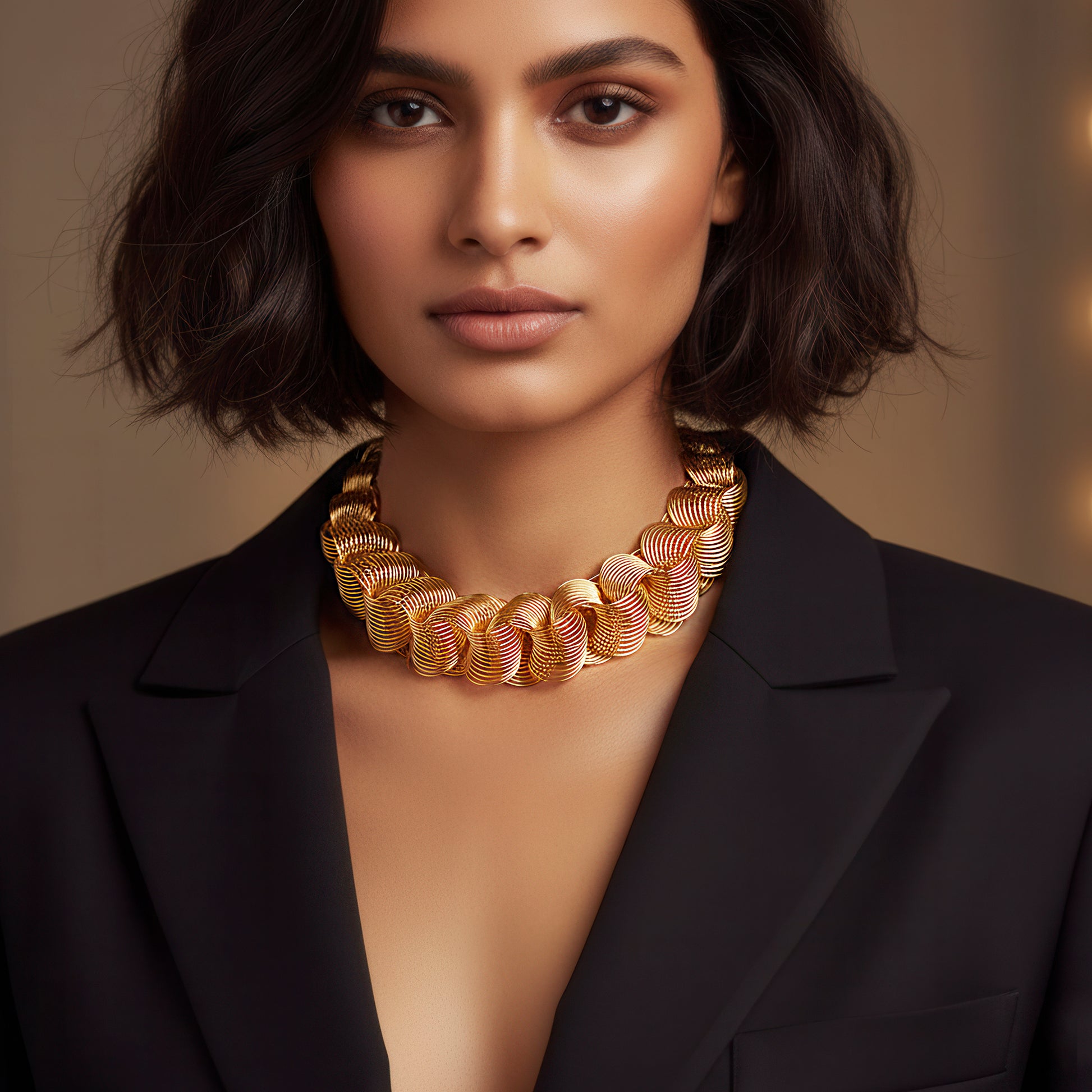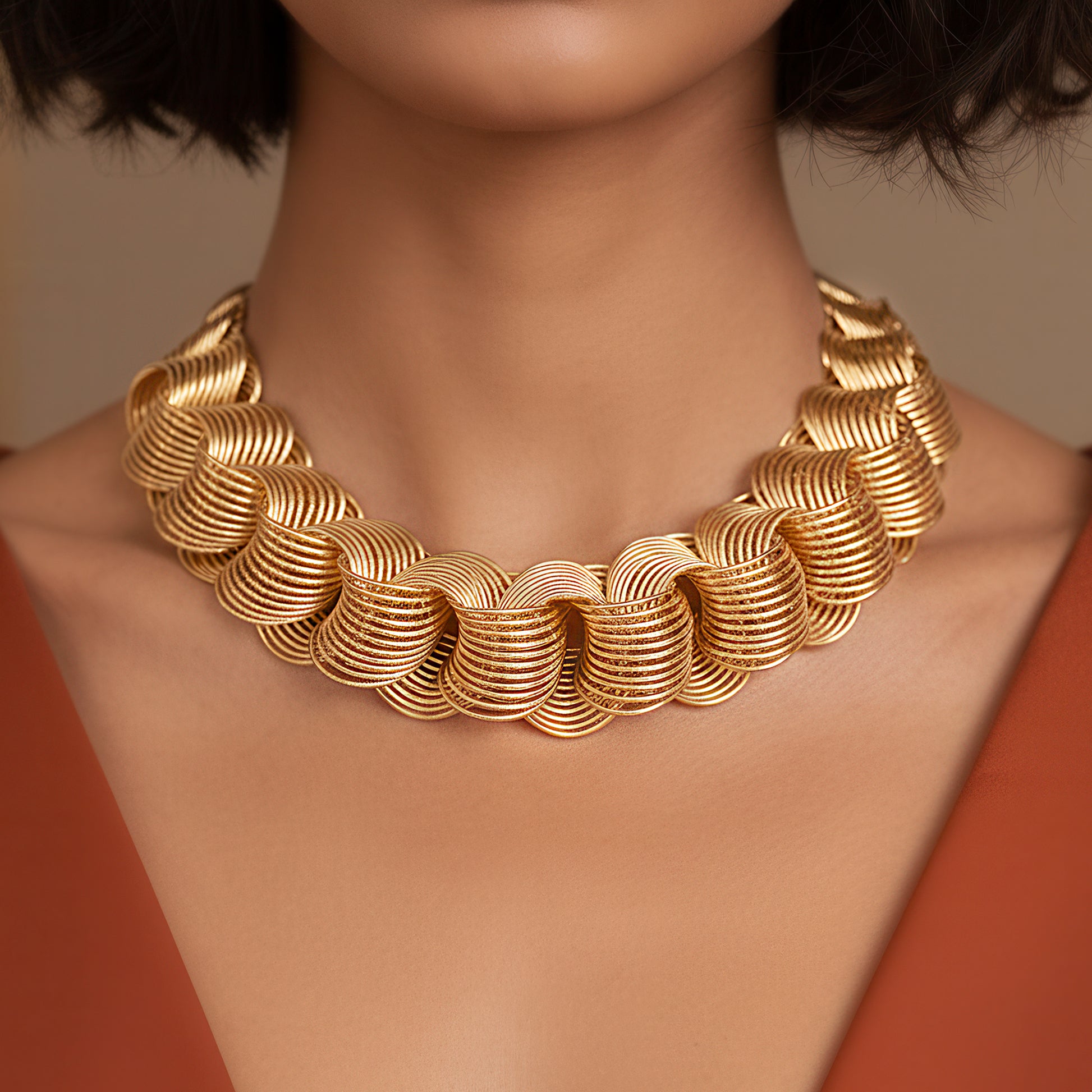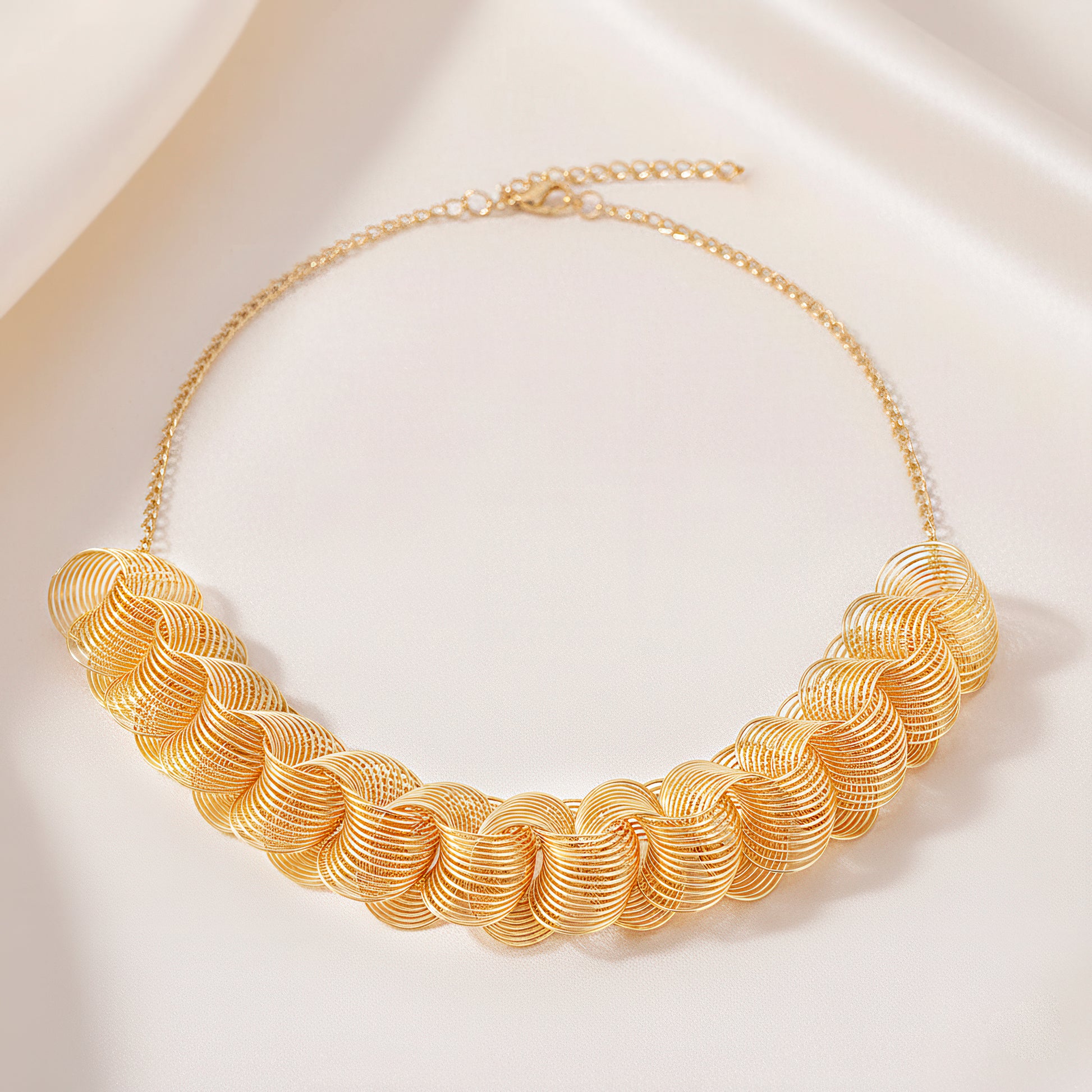 This gorgeous gold-tone necklace with interconnected spring-inspired pieces will make a striking fashion statement. Its distinctive structure, which combines sophistication and current style seamlessly, was designed to provide a touch of modern elegance. Its opulent appeal is enhanced by its polished, smooth surface, which makes it the ideal addition to both formal and informal ensembles. This necklace, which is stunning and lightweight, fits comfortably around the neckline and subtly enhances any ensemble. It offers a sophisticated touch of glitz whether worn with an evening gown, a sleek dress, or a fashionable jacket. This multipurpose piece is a must-have for jewelry aficionados and is perfect for parties, special occasions, and daily use. It is a classic addition to any collection and the ideal present for people who value striking and sophisticated accessories.