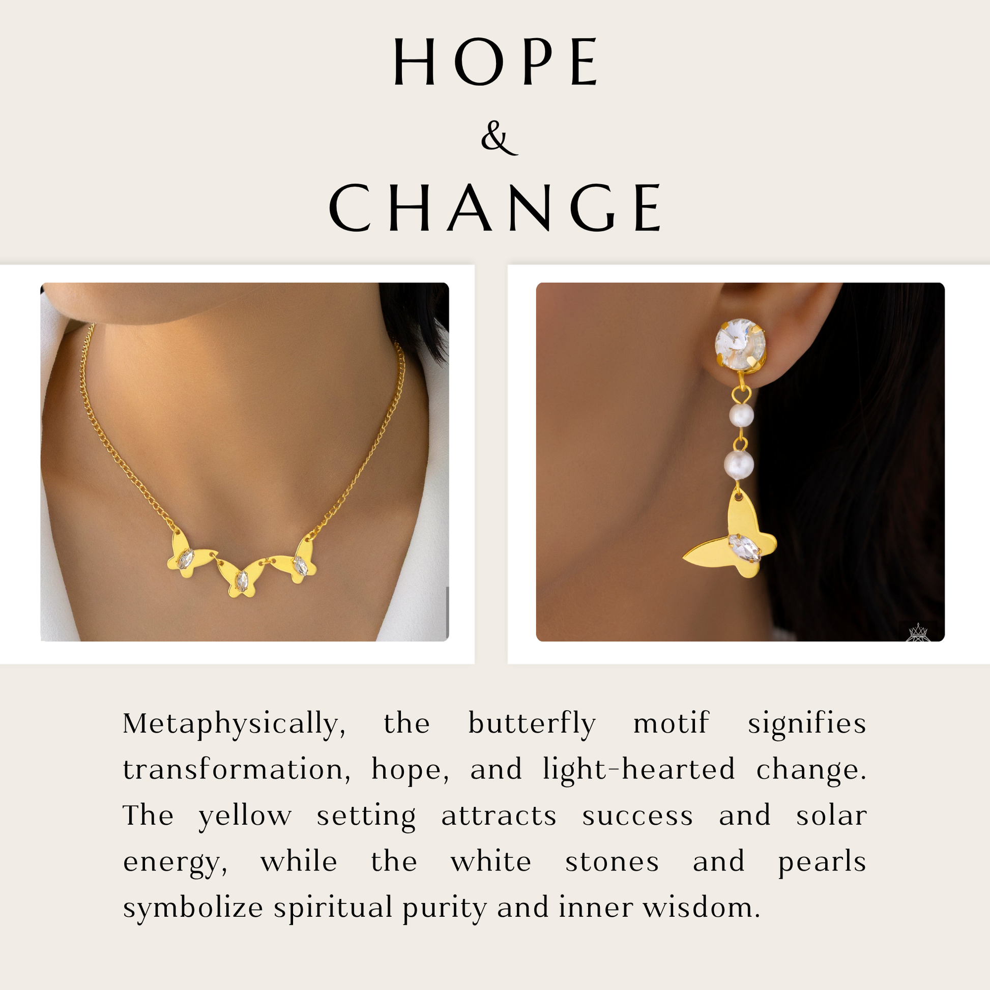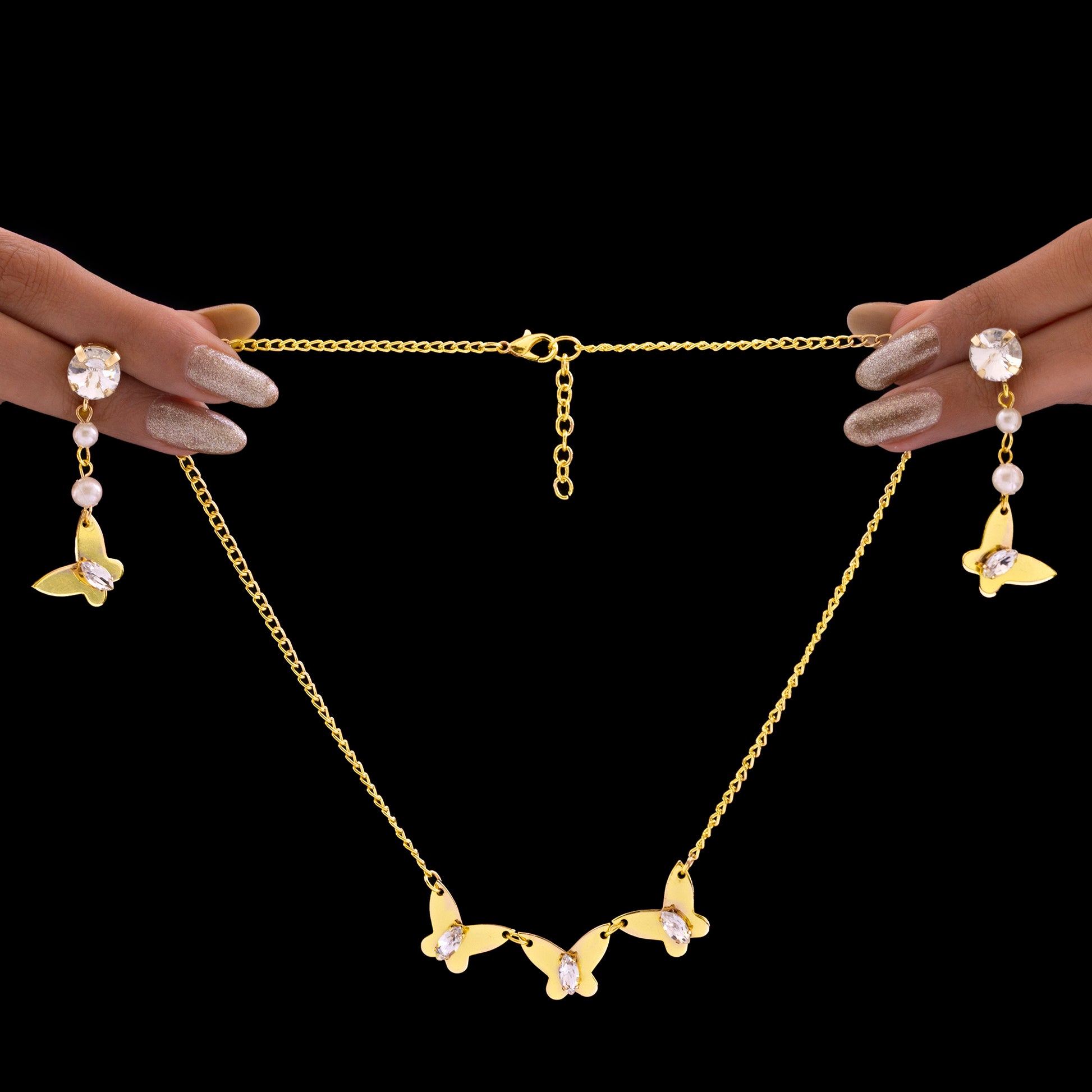 This gorgeous necklace set, which includes three exquisitely carved butterfly charms adorned with delicate pearls and brilliant crystal embellishments, exudes elegance. A classic addition to any jewelry collection, the elegant design represents beauty and metamorphosis. While the glittering crystals catch the light and produce a radiant appearance with each movement, lustrous pearls lend a touch of refinement. This set is lightweight, adaptable, and goes well with both formal and casual attire, making it ideal for everyday wear as well as special events and festivities. It adds a sophisticated charm to any ensemble, whether it is worn with an evening gown, a stylish dress, or ethnic clothing. This combination, which embodies grace, femininity, and elegance in magnificent design, makes the ideal present for a loved one or a gorgeous accessory for you.