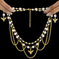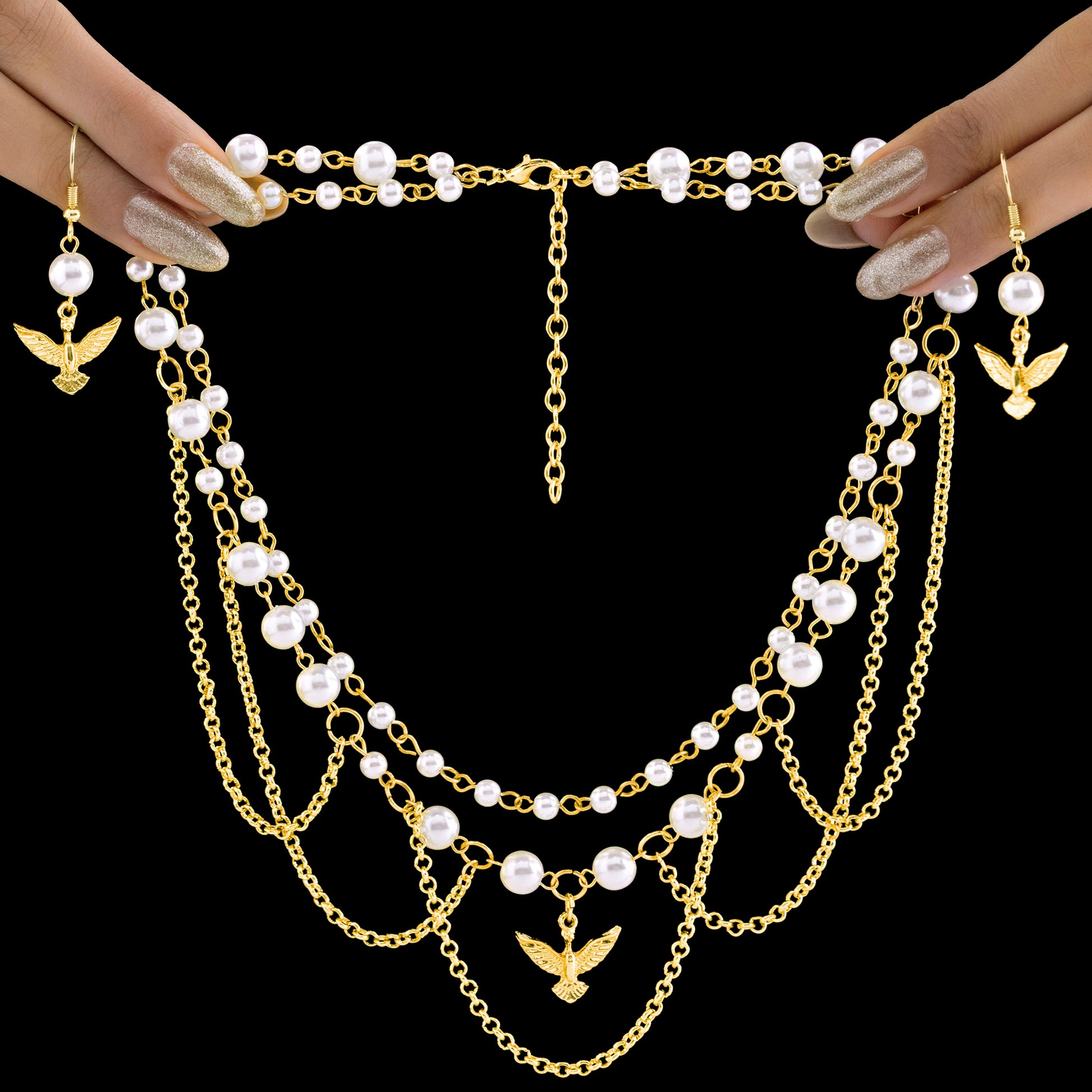 This gorgeous necklace set, with its opulent combination of pearls and chain accents, is sure to turn heads. The cascading pearl arrangement lends a touch of luxury, and the tiered chains give it a modern, edgy appeal. It is designed for people who enjoy a blend of elegance and assertive flair. The design is finished with a gorgeously made bird charm that represents elegance and freedom. This set's distinctive blend of sounds and components makes it a flexible addition to both traditional and modern ensembles. Comfort without sacrificing glitz makes it ideal for festive events, special occasions, or adding a fashionable accent to regular clothing. This gorgeous set combines elegance, artistry, and symbolism into one stunning item that would be a wonderful present or a striking addition to your jewelry collection.