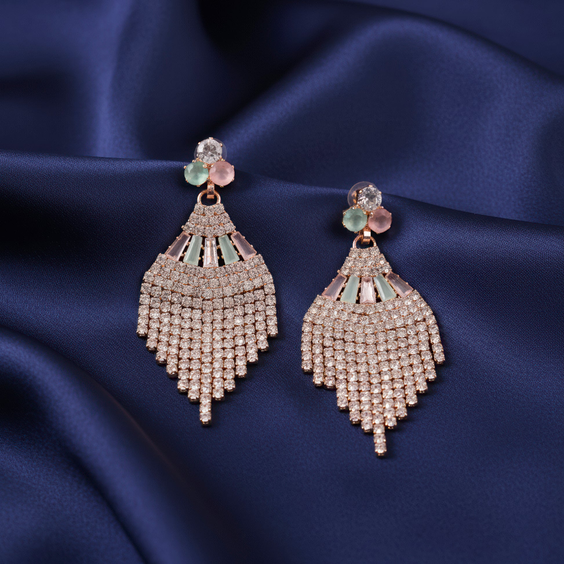 With their exquisite pink and mint baguette stone embellishments, these rhinestone waterfall tassel earrings are sure to turn heads. The flowing strands of rhinestone are crafted to sparkle, producing a smooth, waterfall-like impression that changes with each motion. The delicate shades of pink and mint baguette stones provide a welcome splash of color, fusing refinement and delicacy. These striking earrings add flair and drama to any ensemble, making them ideal for evening gatherings, weddings, and celebrations. You will stand out in any crowd because to the exquisite craftsmanship and dazzling polish. They are impactful and lightweight, providing all-day comfort without sacrificing style. These earrings are the ideal addition to add charm, elegance, and a dash of playful glitz to any ensemble, whether it's classic or modern.