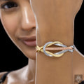 This tri-tone snake chain bracelet is sophisticated and contemporary, a remarkable combination of style and edge. Its sleek, flexible form highlights three complementing tones—rose gold, silver, and gold—that blend harmoniously together. A chic knot motif at the center creates a distinctive focal point and represents harmony and enduring connection. The smooth, polished finish of the snake chain catches the light with every movement, and its fluid texture fits gently around the wrist. This bracelet is made to go well with a variety of outfits and can be worn with anything from casual daytime to elegant evening attire. Its snug fit is guaranteed by its strong clasp, and the tri-tone color scheme makes matching it with other jewelry items simple. This bracelet is a statement of modern elegance and adaptability, bold but sophisticated.