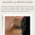 These exquisitely made jhumki dangle earrings, which are meant to evoke classic elegance and tradition, will add a touch of sophistication to any ethnic ensemble. Each earring is a masterpiece that draws attention with its exquisite artistry, with elaborate detailing and sparkling stone accents. Delicate pearl inserts that gently sway lend movement and a touch of refinement to the traditional jhumki silhouette. These earrings go well with sarees, lehengas, or salwar suits and are excellent for celebrations, weddings, or cultural events. The combination of soft pearls and shimmering stones strikes a lovely balance between subtlety and brilliance. They are impactful and lightweight, providing all-day comfort without sacrificing style. Enhance your jewelry collection with this stunning pair that elegantly honors tradition while adding a contemporary touch, adding a special touch to every occasion.