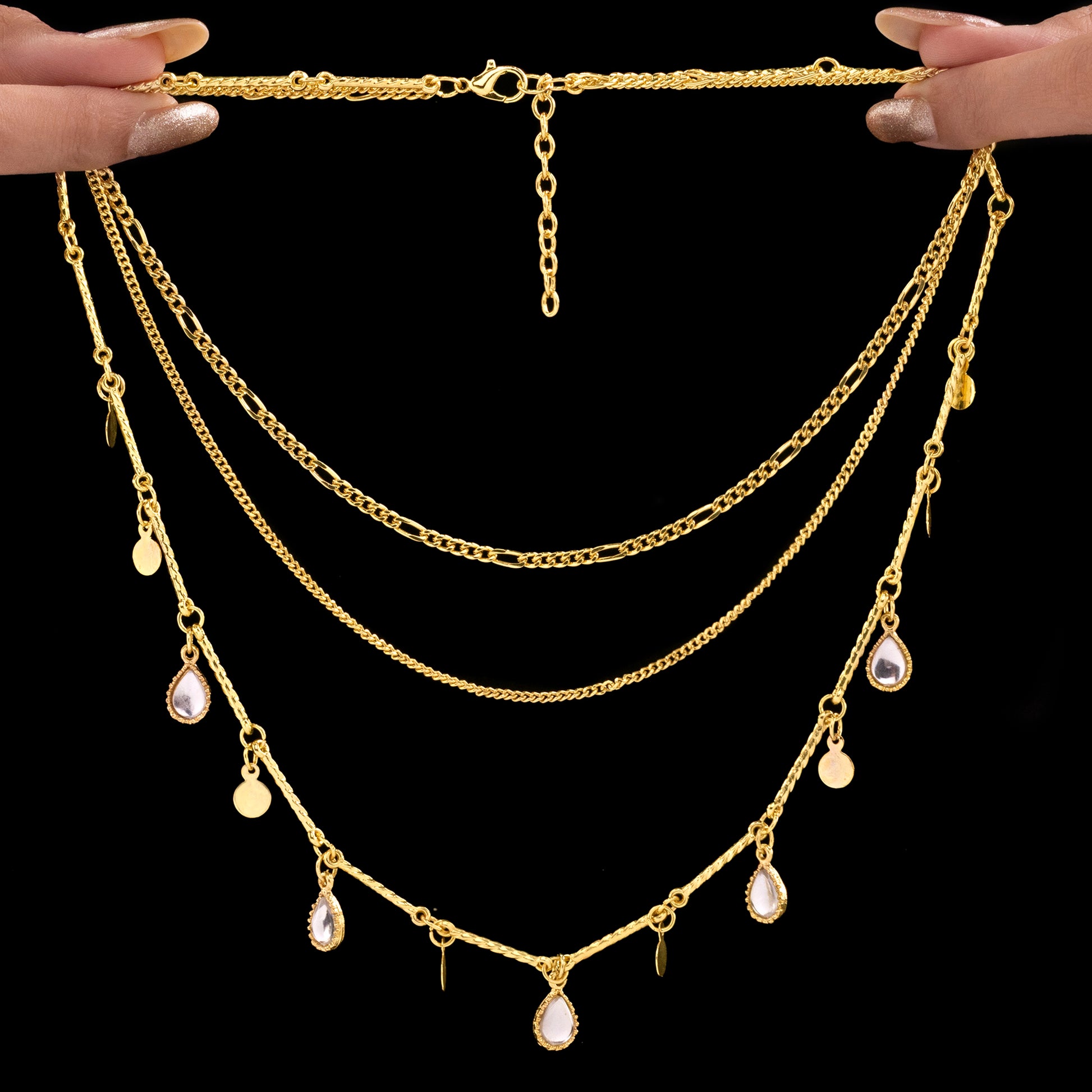 This triple-layer varied chain necklace will up your accessory game because it is expertly crafted to produce a stylish, layered effect in a single, easy-to-wear item. The texture and length variations of each chain provide depth and dimension while preserving a pleasing harmony. The necklace, which is embellished with delicate coin and crystal charms, combines modern and vintage design elements. While the sparkling crystal gives a touch of shine and catches the light with each movement, the coin charm offers a classic, antique-inspired appeal. This necklace is a must-have for every jewelry enthusiast since it is fashionable and versatile, looking great with everything from dressy gowns to casual t-shirts. It is pleasant to wear, lightweight, and firmly fastens, giving your appearance a professional touch. Ideal for both statement-seekers and layering enthusiasts.