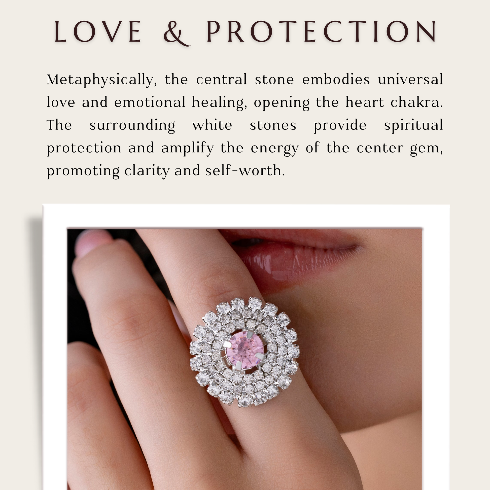 The stunning crystal rhinestone design of this adorable little statement ring exudes style and glimmer. A vivid pink stone sits at its heart, giving the piece a splash of color and a hint of femininity. The surrounding rhinestones add to the core gem's brilliance, producing an eye-catching sheen. Because of its small size, it can be worn alone or stacked with other rings to create a modest yet eye-catching effect. The ring, which was meticulously crafted, strikes a balance between bold flair and delicate beauty, making it appropriate for both special events and daily wear. Comfortable and lightweight, it is a sophisticated accessory choice that elegantly adds a pop of color and sparkle to any ensemble.