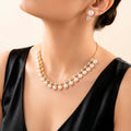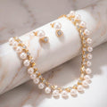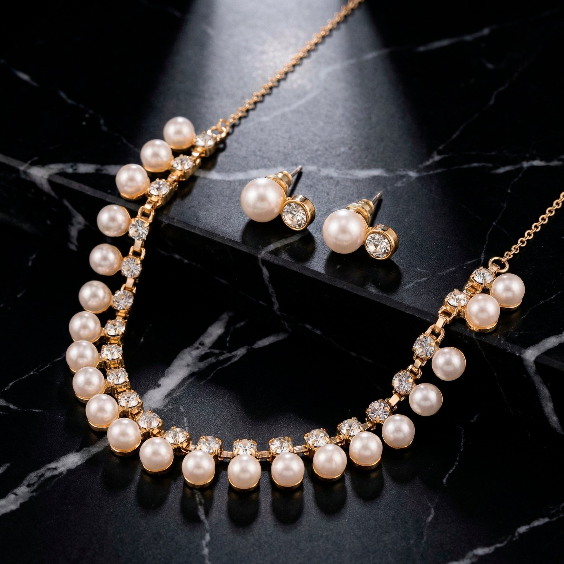 This minimalist statement necklace set, which captures the spirit of modern refinement, is inspired by contemporary elegance and boasts a sophisticated blend of pearls and sparkling crystals. The necklace adds the perfect amount of shine without overpowering your ensemble thanks to its simple design and well-placed pearl and crystal accents. This pair looks well-balanced and sophisticated when worn with matching stud-style earrings, making it appropriate for both daytime and evening use. Comfort is guaranteed by the lightweight design, and the neutral hues make it simple to match with a variety of ensembles, including stylish casual wear and formal gowns. This combination provides a touch of classic elegance and flair, making it a perfect complement to any jewelry collection and perfect for people who value subtle splendor.