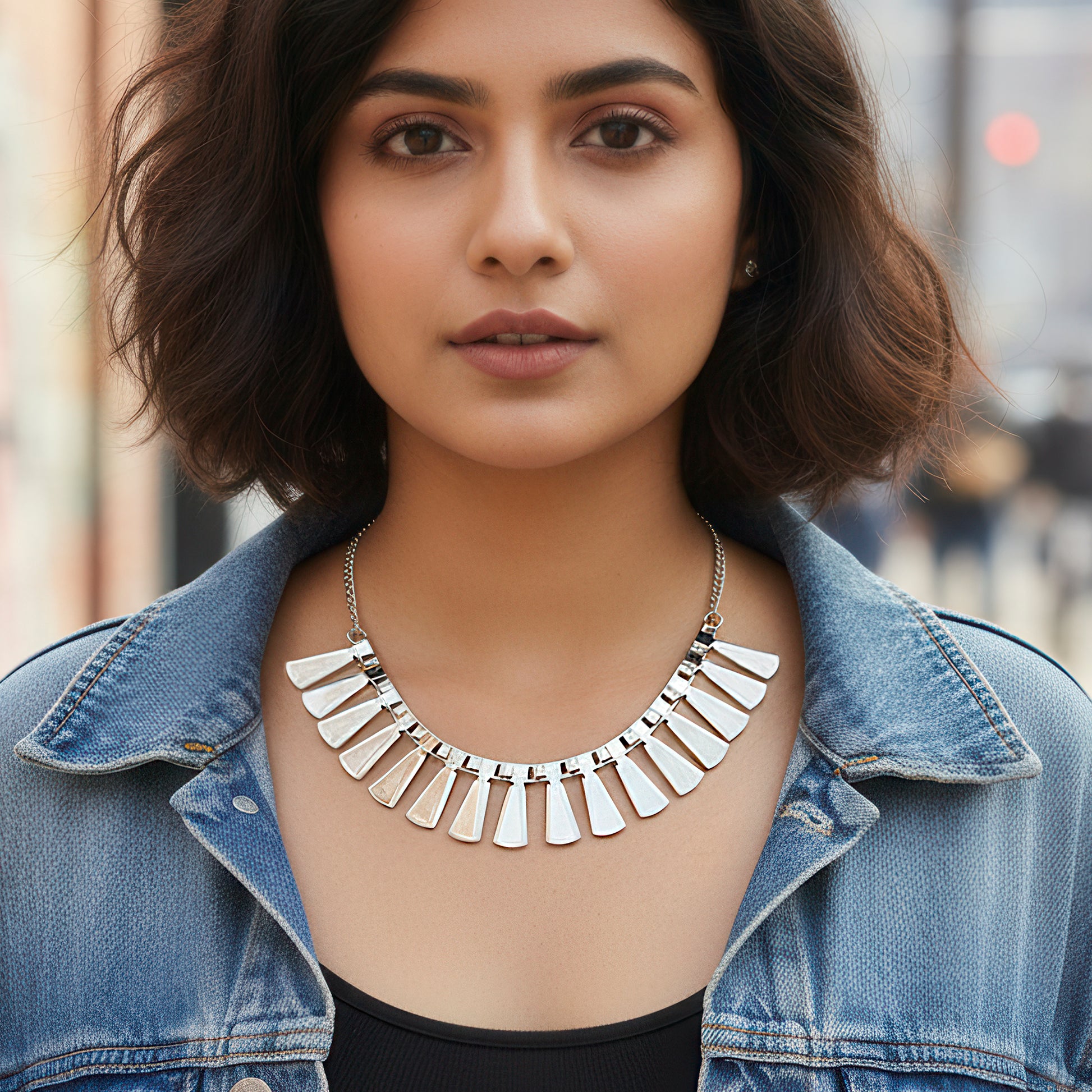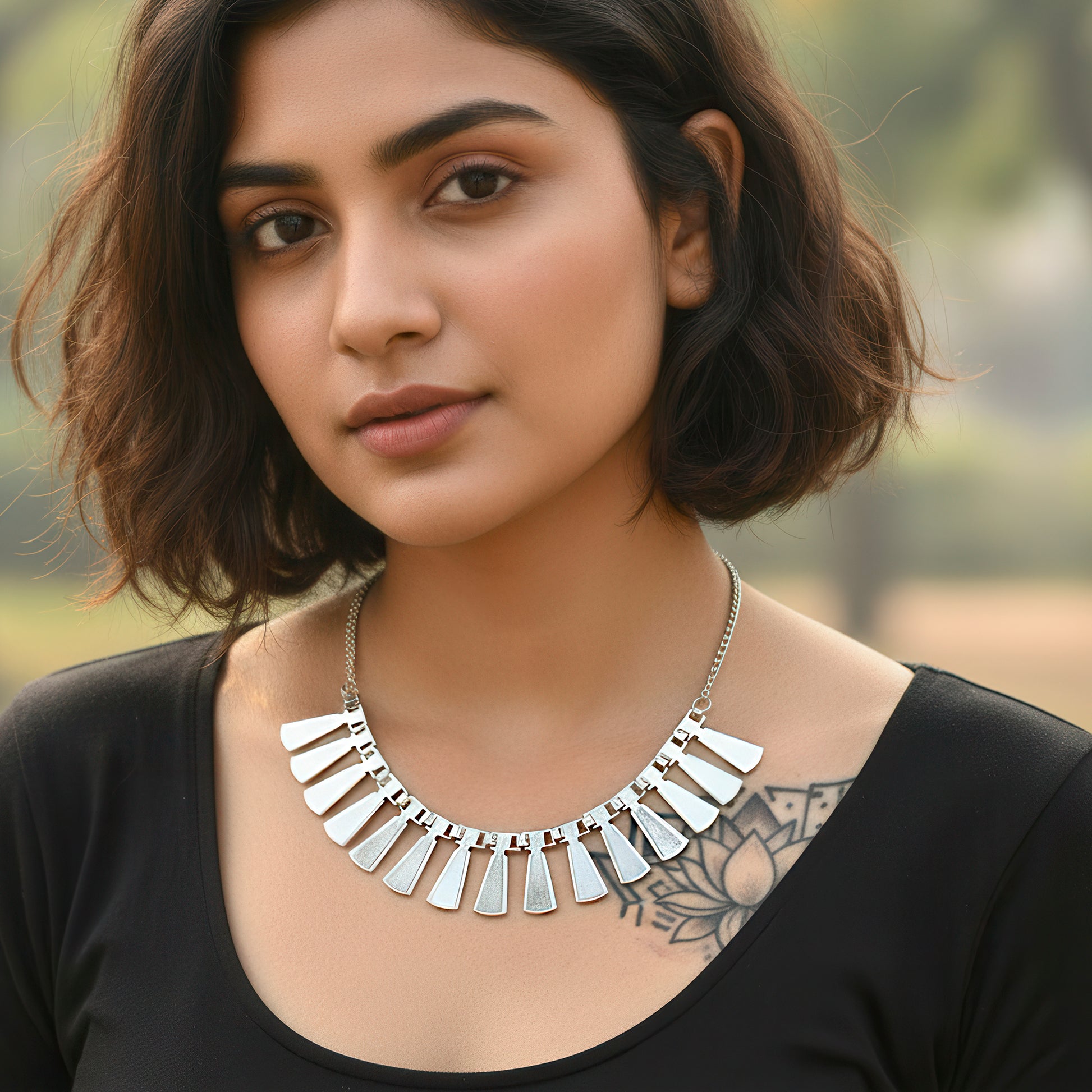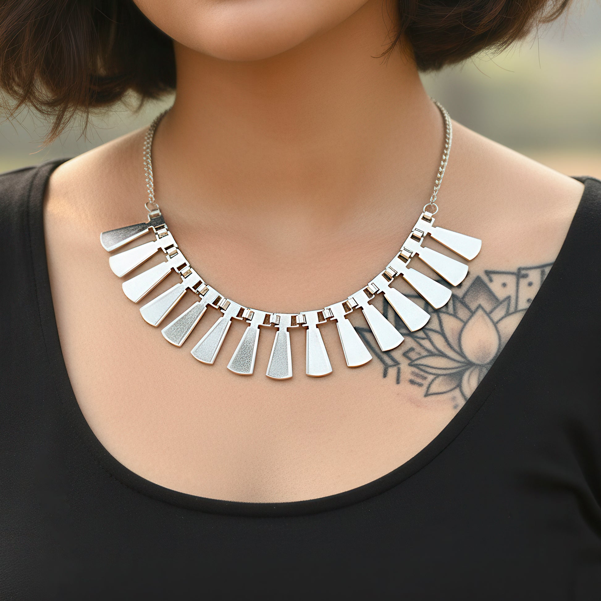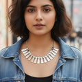 This bold and creative statement necklace with a tribal theme has eye-catching geometric designs that make a strong visual impression. Each component is expertly crafted and exhibits a fusion of contemporary edge and traditional tribal design, making it a distinctive accessory. The well-balanced yet striking silhouette created by the structured pattern of triangles, circles, and angular lines looks great around the neckline. This piece, which adds texture and depth to any ensemble, combines earthy tones and metallic finishes, drawing inspiration from modern fashion. It instantly makes a statement in your closet and is perfect for combining with solid colors or minimalist styles. This necklace is ideal for people who enjoy using fashion to show their uniqueness because it is both lightweight and powerful. A daring blend of tradition and contemporary design.