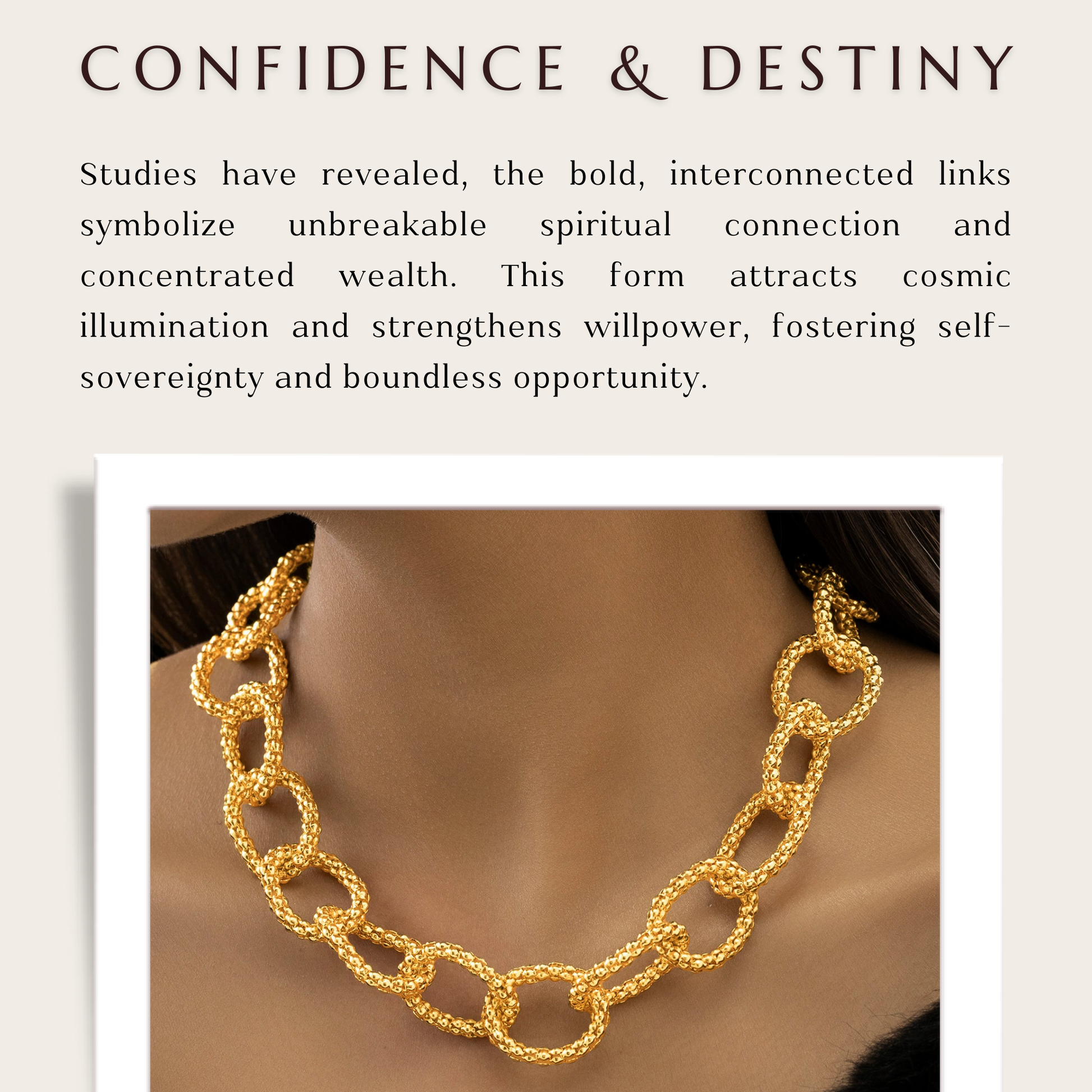 This massive chain necklace is bold and striking, adding a standout piece to any ensemble. Each link's popcorn-like texture and exquisite light reflection give it an opulent and dynamic appearance. It is the ideal item to enhance both formal and casual ensembles because of the strong, interlocking links that produce a contemporary silhouette that rests pleasantly on the neckline. Wearing it alone or stacked with other necklaces gives your look a self-assured edge. From elegant gowns to crisp blouses, its adaptable tone goes well with a variety of hues and ensembles. This piece, which was made for people who enjoy unique accessories with a stylish twist, skillfully combines current fashion with classic charm. A must-have for everyone who wants to look put together with little work.