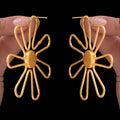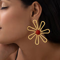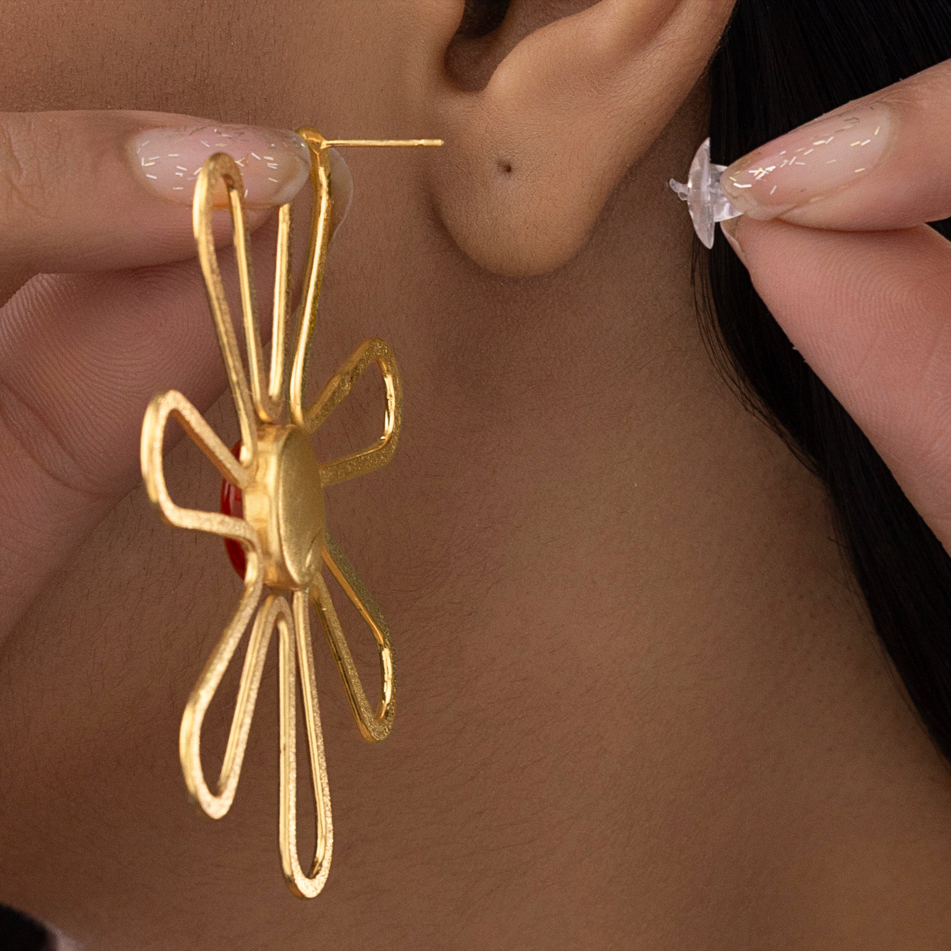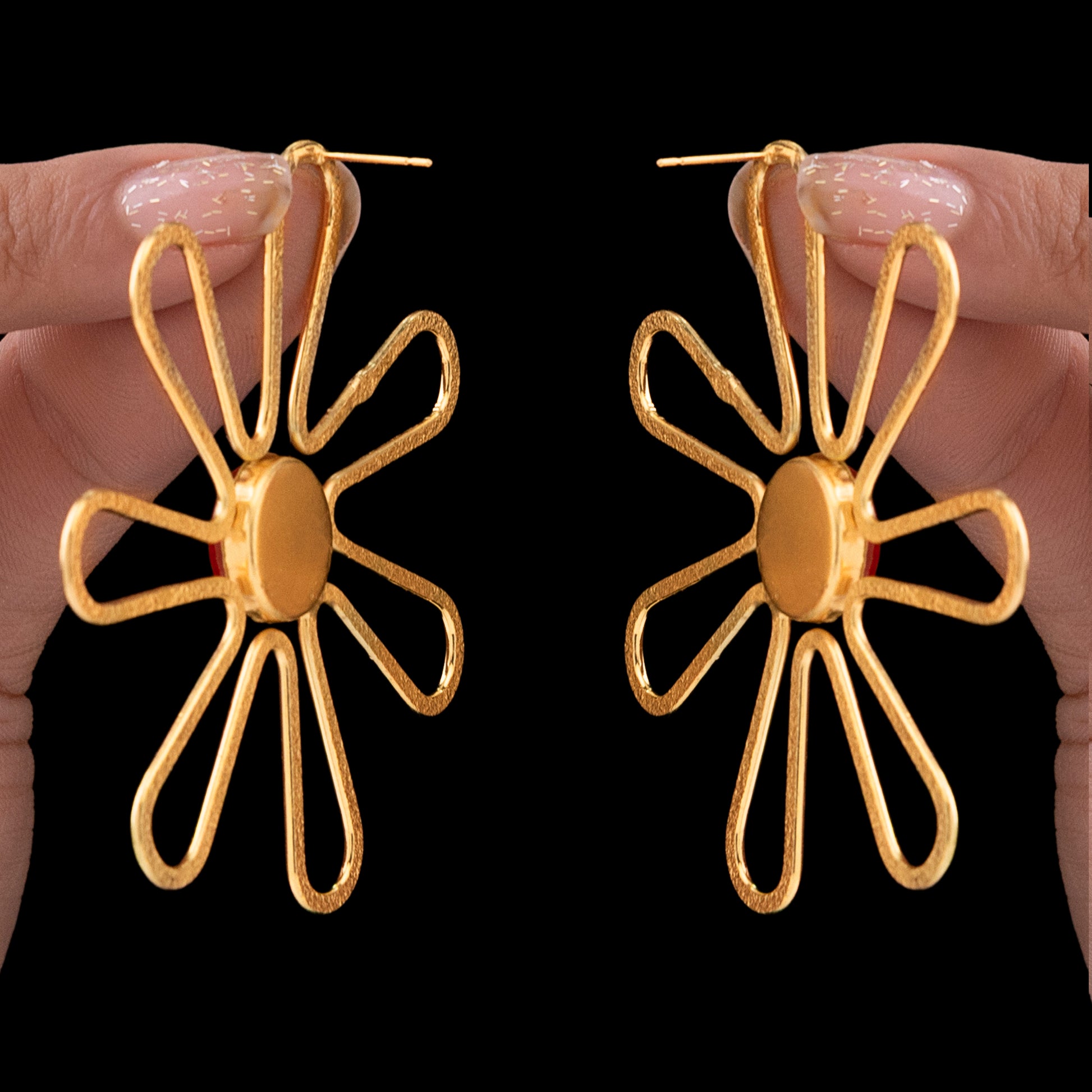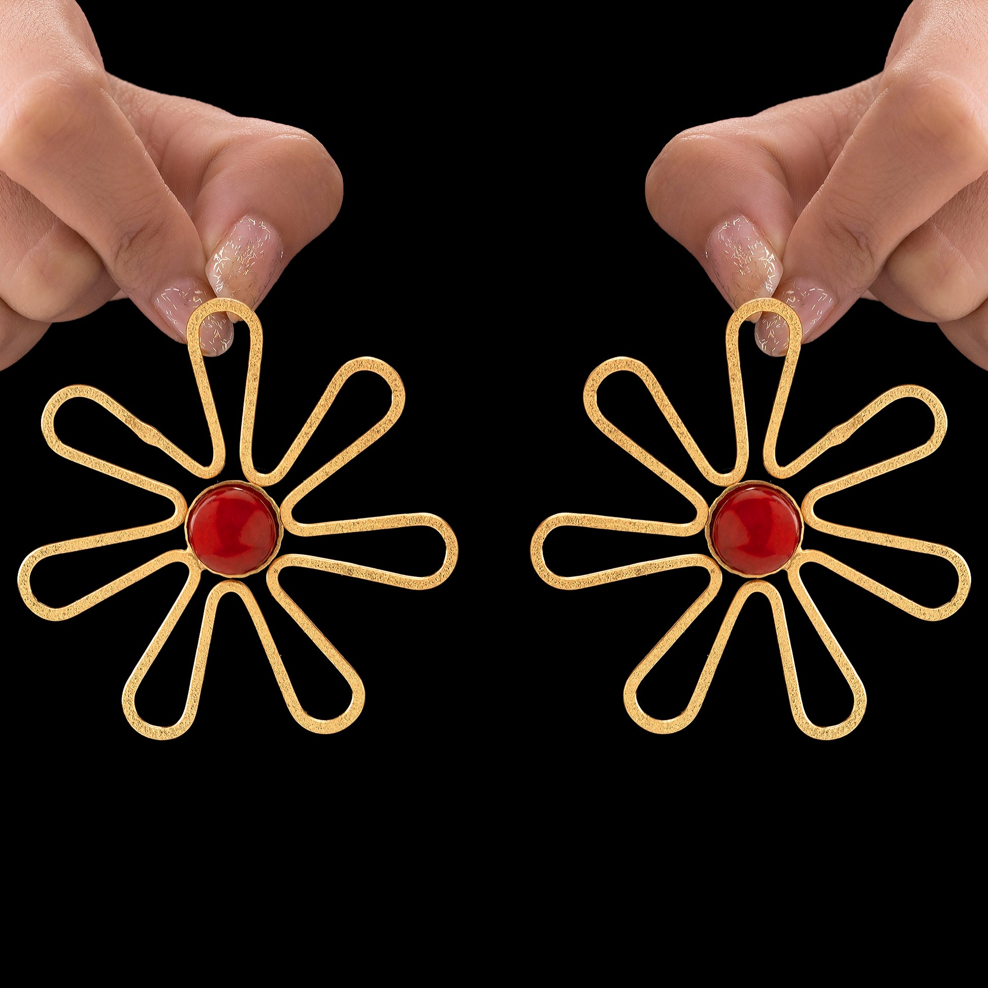 These enormous outlined flower earrings with a gorgeous red cabochon stone in the middle will make a striking and creative statement. The design creates a bold yet elegant accessory that is ideal for high fashion events or special occasions by fusing modern elegance with floral inspiration. The rich red stone offers a splash of color and a hint of luxury, while the delicately defined petals give the earrings a light, airy appearance. These earrings, which are made to stand out, subtly improve any appearance, from a basic dress to a nightgown. They are perfect for extended wear because of the easy and comfortable push-back closure. These earrings add a special charm and self-assurance to your appearance, whether you're dressing for a glamorous photo session or attending a joyous party.