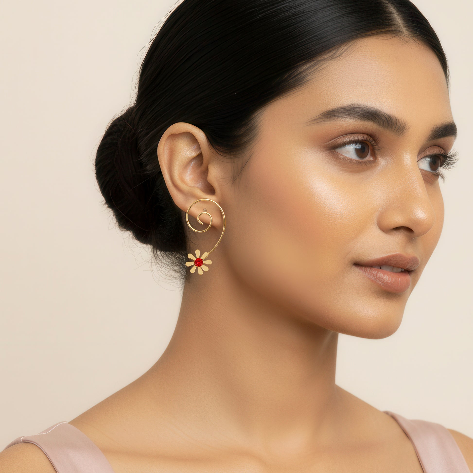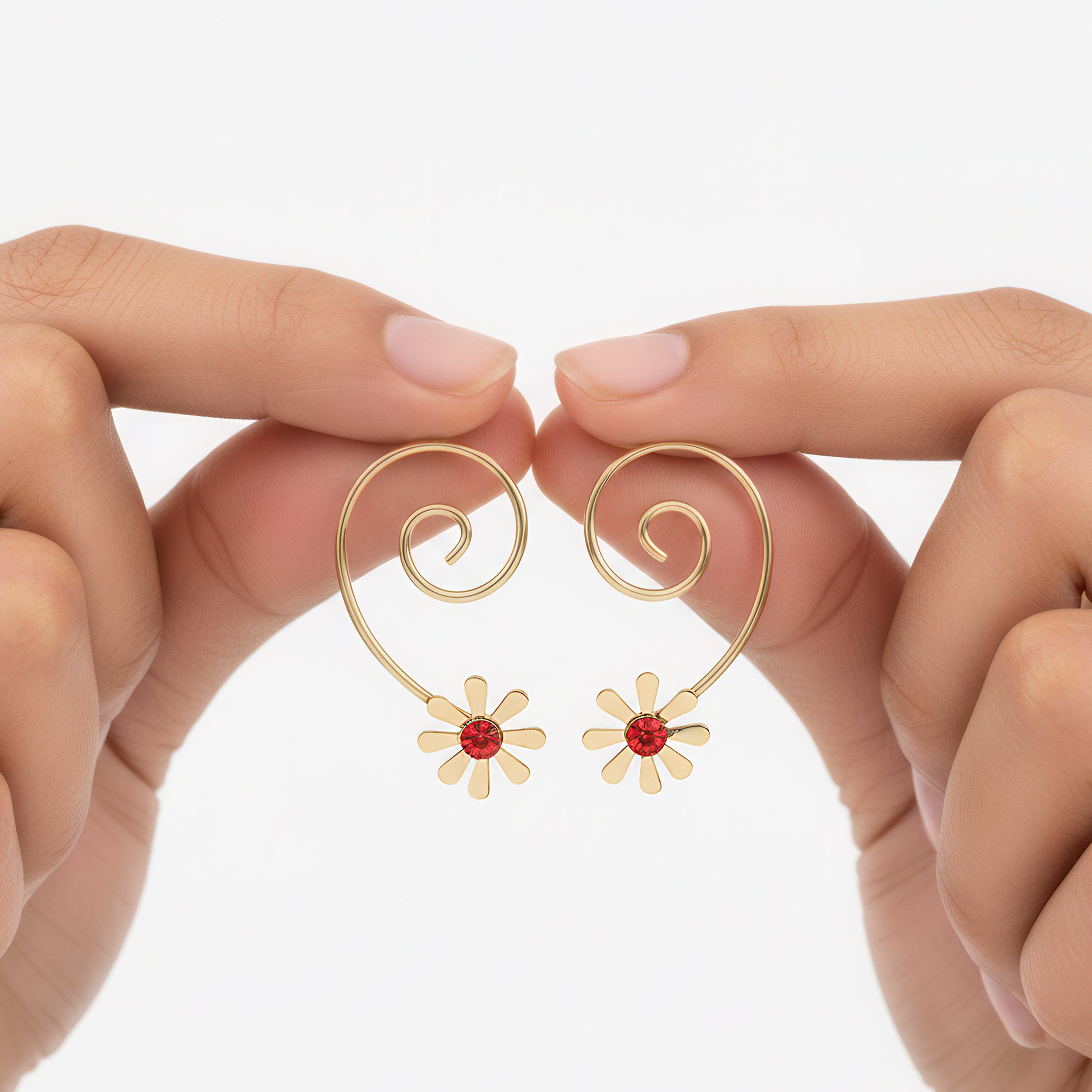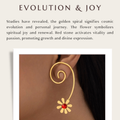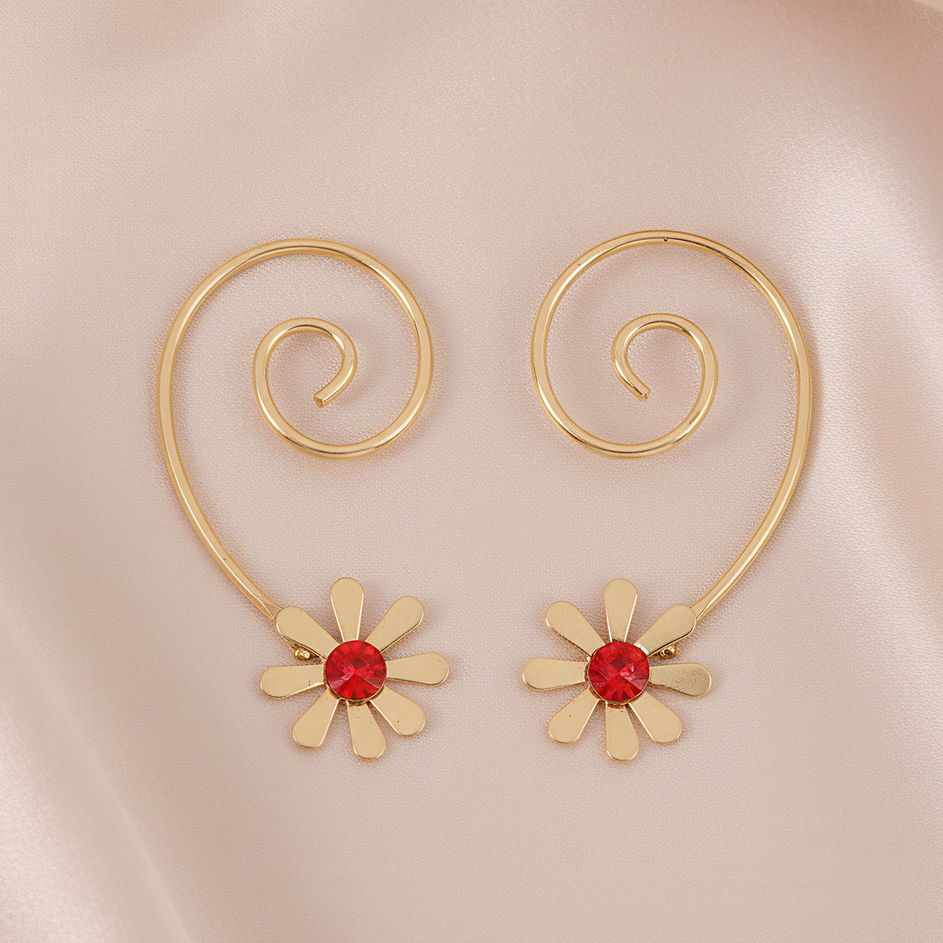 These exquisitely designed loose spiral wired dangle earrings will add a whimsical yet sophisticated touch to your ensemble. Each piece's flowing spiral wirework design produces elegant movement that captures the light at every angle. A delicate floral design blossoms at the base, attracting attention with a brilliant red crystal that provides a striking splash of color. The dynamic structure adds a touch of artistic flair, while the open shape keeps them comfortable and light for all-day wear. These earrings go well with both ethnic and modern attire, making them perfect for nighttime parties, weddings, and celebrations. Spiral elegance and floral charm combine to create a distinctive item that adds a touch of romance and refinement to bold, expressive looks.