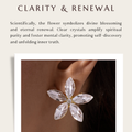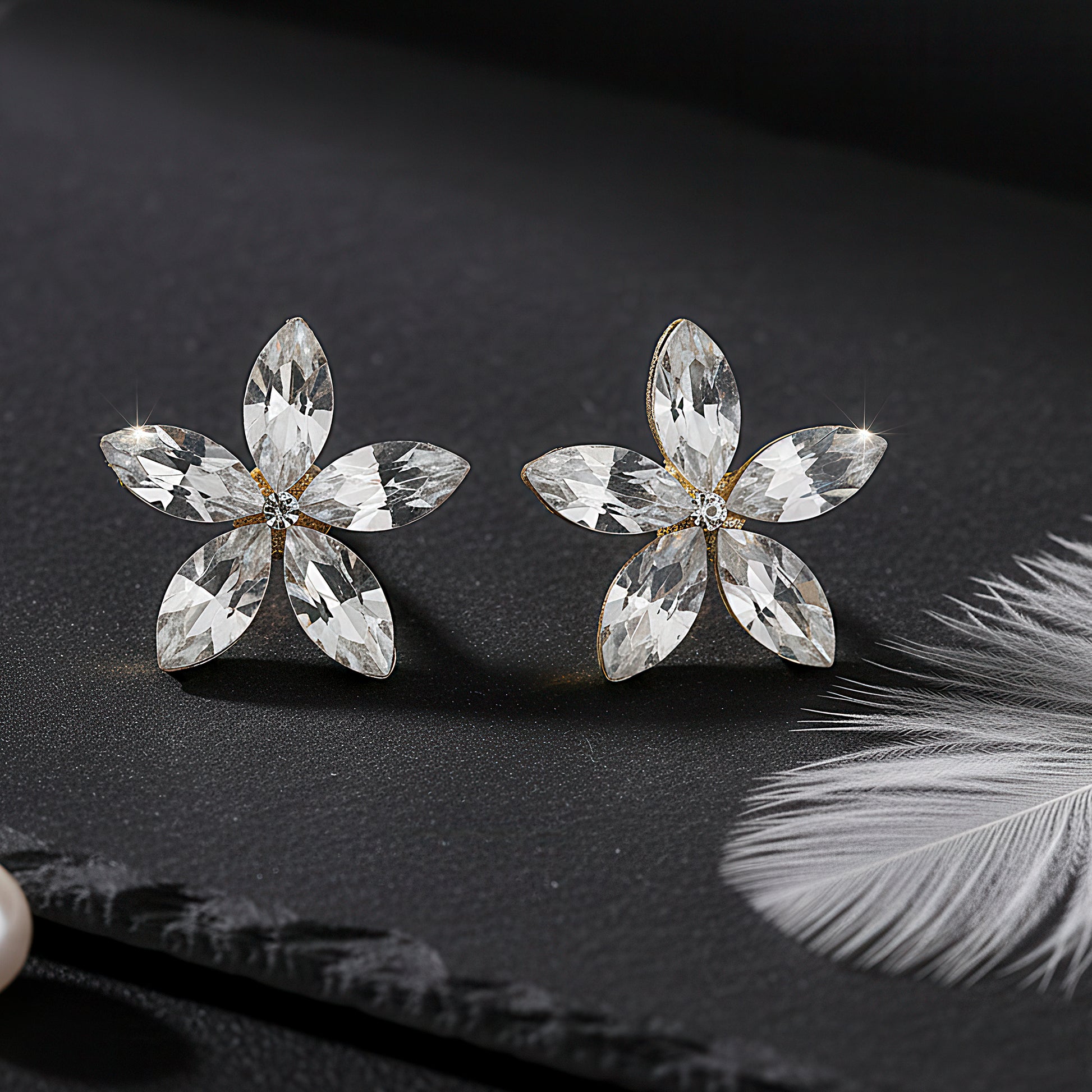 These exquisitely created crystal flower earrings, which are meant to provide a subtle glitter to any ensemble, exude elegance and charm. Shimmering gems create delicate, petal-like forms in each earring's painstakingly constructed floral motif, which catches the light from all directions. These earrings are ideal for both special occasions and daily wear because of their design, which combines classic elegance with a touch of glitz. They are comfy and lightweight, and they add just the proper amount of sparkle without overpowering your ensemble. These earrings add a sophisticated finishing touch to your look whether you're wearing them with a formal outfit, ethnic attire, or a plain dress. They provide a stylish and adaptable accessory that goes well with a variety of fashion moods and occasions, making them perfect for giving or using yourself.