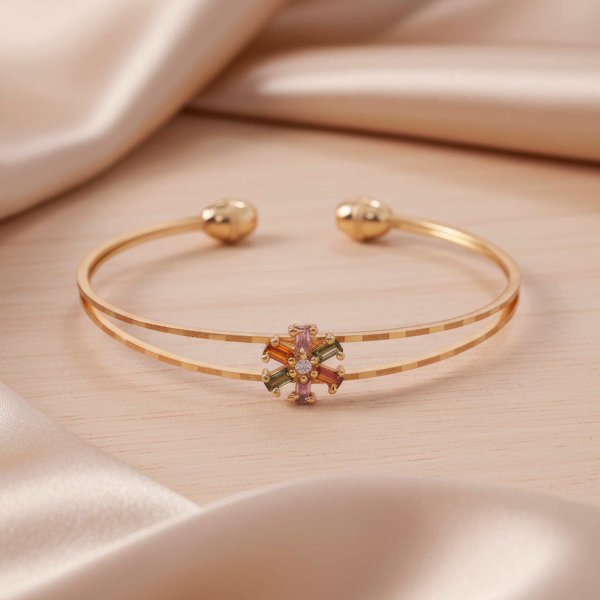 This little multicolored crystal flower bangle bracelet with double lines will add a pop of color and charm to your wrist. Its two elegant rows of small, vivid crystal flowers in a variety of cheery hues are designed to dazzle. The precise precision with which each blossom sparkles adds a whimsical yet sophisticated touch that elevates any ensemble. The multicolored pattern guarantees versatility with a range of styles and moods, while the slim, elegant structure lends it a contemporary appeal. This bracelet is comfortable and attractive, making it ideal for wearing on special events, going out casually, or layering with other bangles. It's a fun addition to your jewelry box that gives your everyday outfit a dash of whimsical, feminine shine. It's lightweight and comfortable to wear.