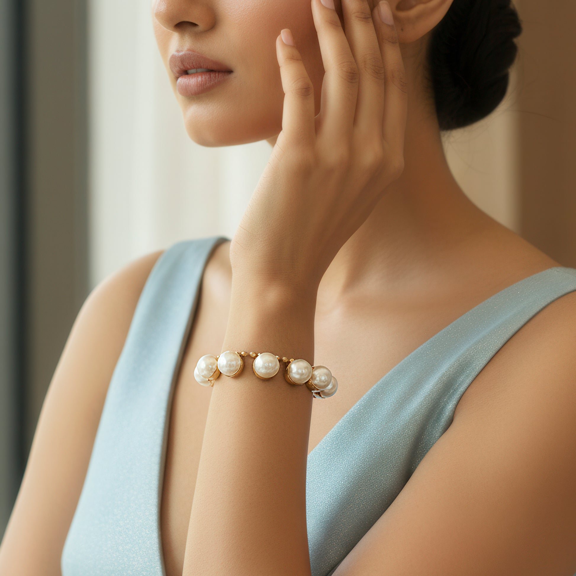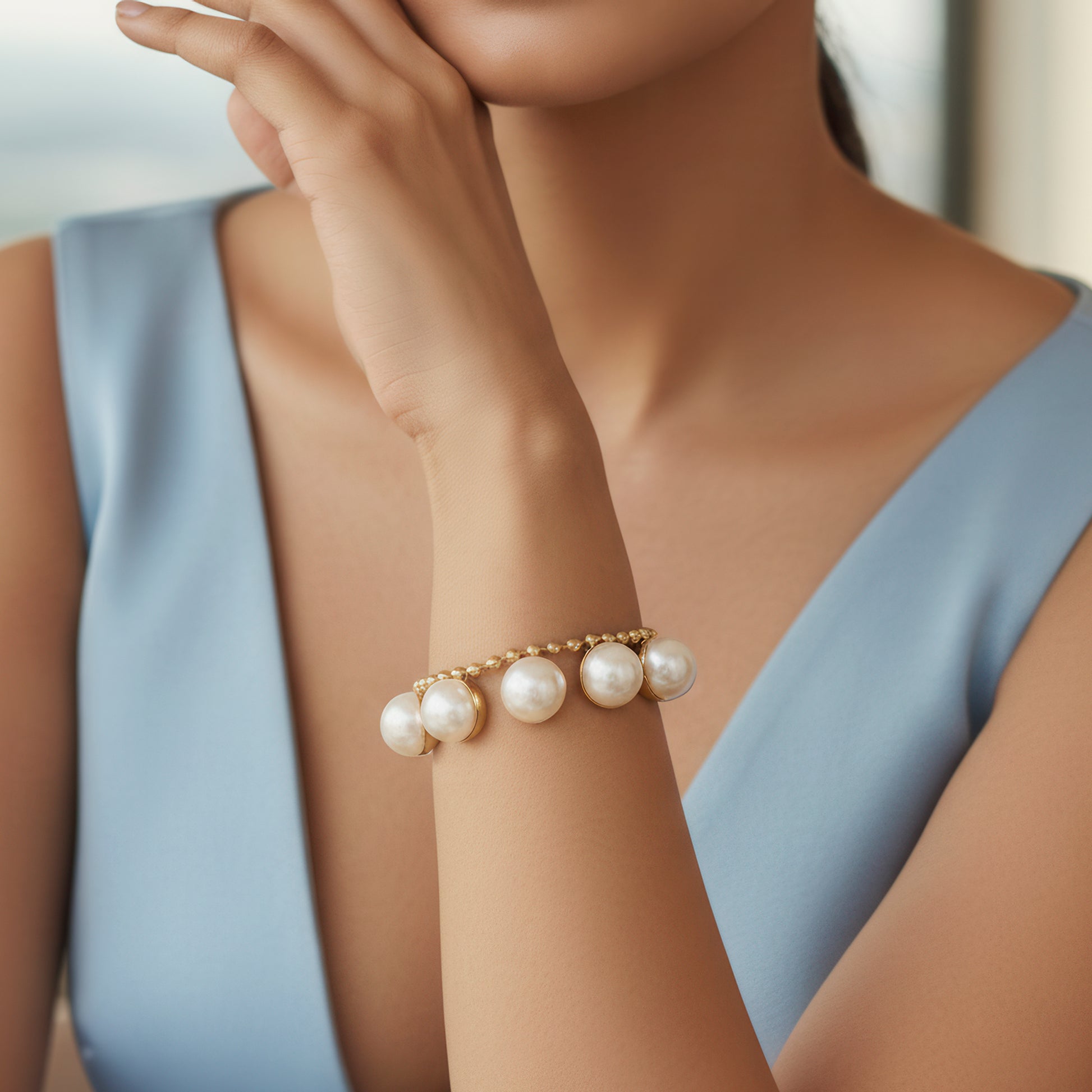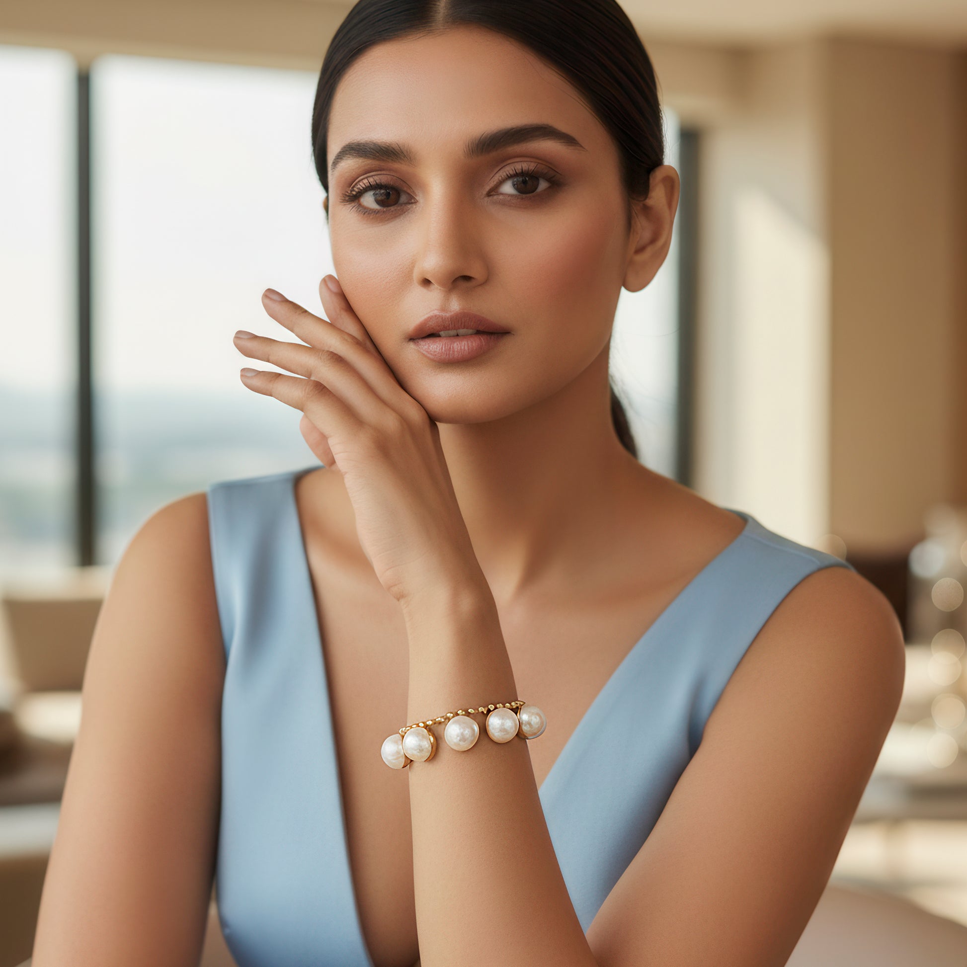 This exquisite bracelet offers the ideal fusion of traditional charm and contemporary sophistication with its exquisitely carved chain and delicately studded pearls. While the delicate chain guarantees a light and comfortable fit around the wrist, the pearls' gentle sheen gives a touch of elegance. Every pearl is firmly placed to improve design and durability, making it perfect for special occasions as well as everyday wear. Its simple yet elegant design makes it easy to combine with other items or make a statement on its own. This bracelet adds classic beauty to any ensemble, whether it's used to dress up a casual outfit or to lend sophistication to formal wear. An elegant piece that, in every way, embodies sophistication, purity, and subtle luxury.