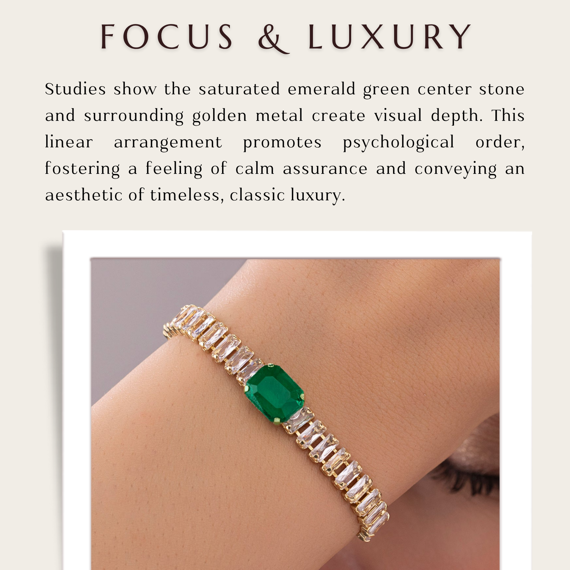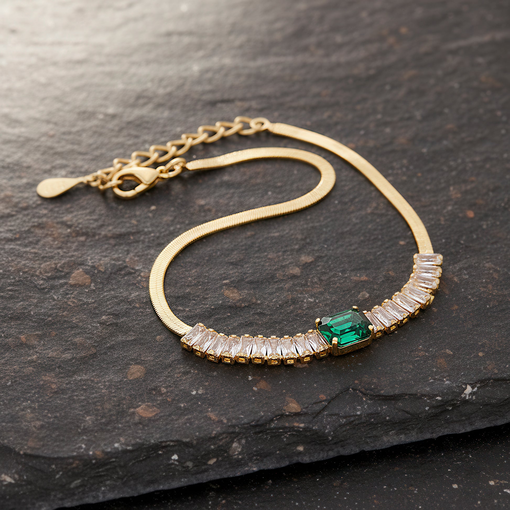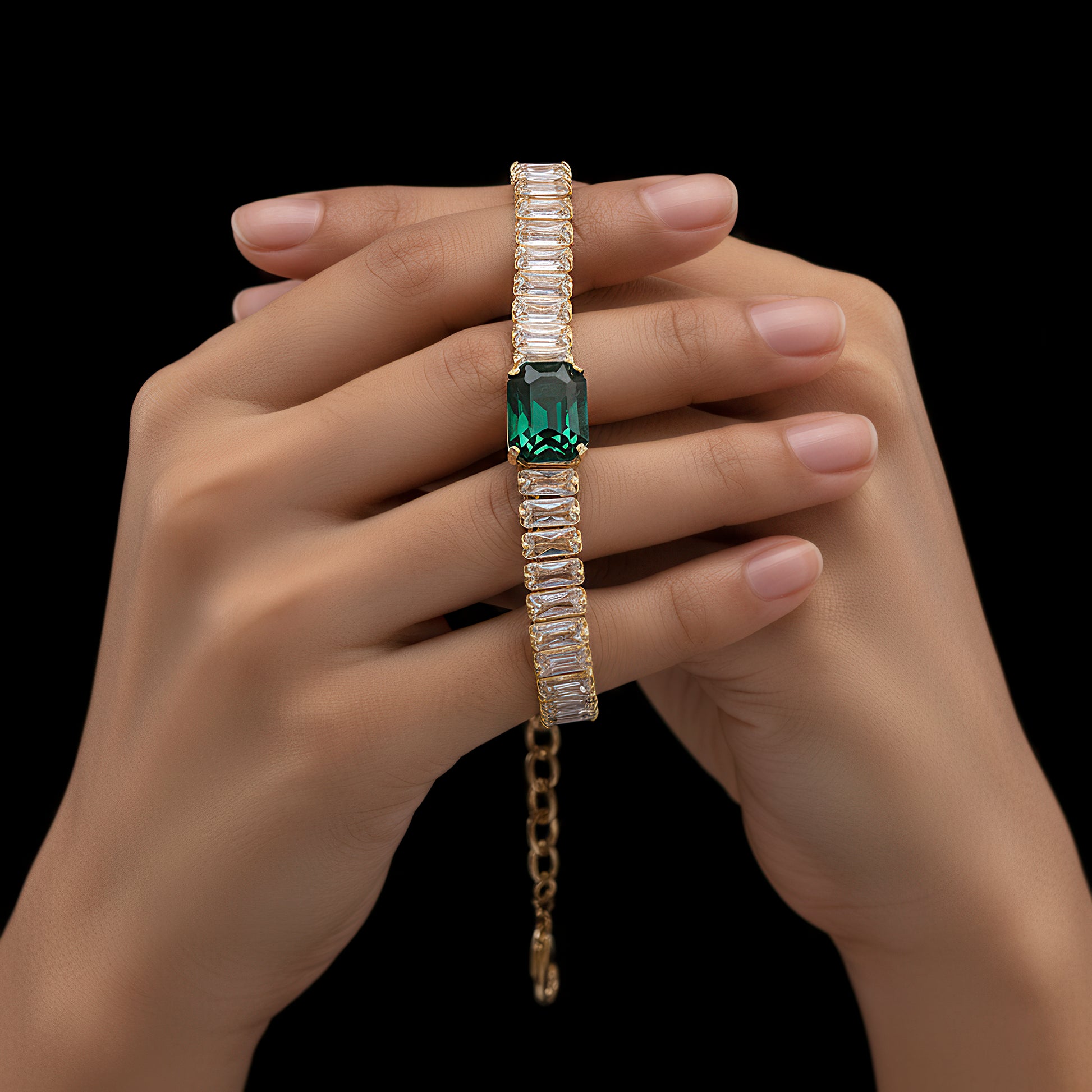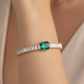 This elegant bracelet offers the ideal fusion of contemporary style and traditional elegance with its slim baguette-shaped chain set with eye-catching green stones. Each stone's crisp, rectangular cut provides a sophisticated geometric touch, while the deep green color adds charm and brightness. The stones are expertly arranged to form a continuous line of color and dazzle around the wrist, set on a delicate yet sturdy chain. This bracelet is comfy and lightweight, making it perfect for special occasions as well as daily wear. It is a unique addition to any jewelry collection because of its adaptable style, which goes well with both formal and informal ensembles. This bracelet gives your ensemble a sophisticated edge and a splash of color, whether it is worn alone or layered.