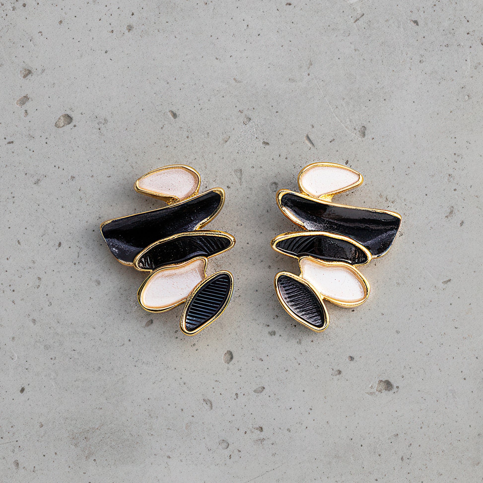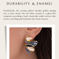 Soft white and deep blue enamel bring the artistic fusion of abstract shapes to life in these gorgeous earrings. Any ensemble is elevated with a dash of refinement and originality because to the flowing design's contemporary, sculpture-like vibe. For individuals who value distinctive, eye-catching accessories, the clashing colors provide a sophisticated balance that is both delicate and striking. These earrings are comfy and lightweight, making them perfect for any occasion, from a sophisticated evening event to a laid-back day out. The abstract shapes provide classic design a modern twist, and the glossy enamel finish adds to the aesthetic appeal. To add effortless charm and uniqueness to your appearance, pair them with western or fusion attire. Every detail is a true manifestation of contemporary creativity.