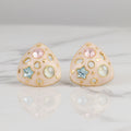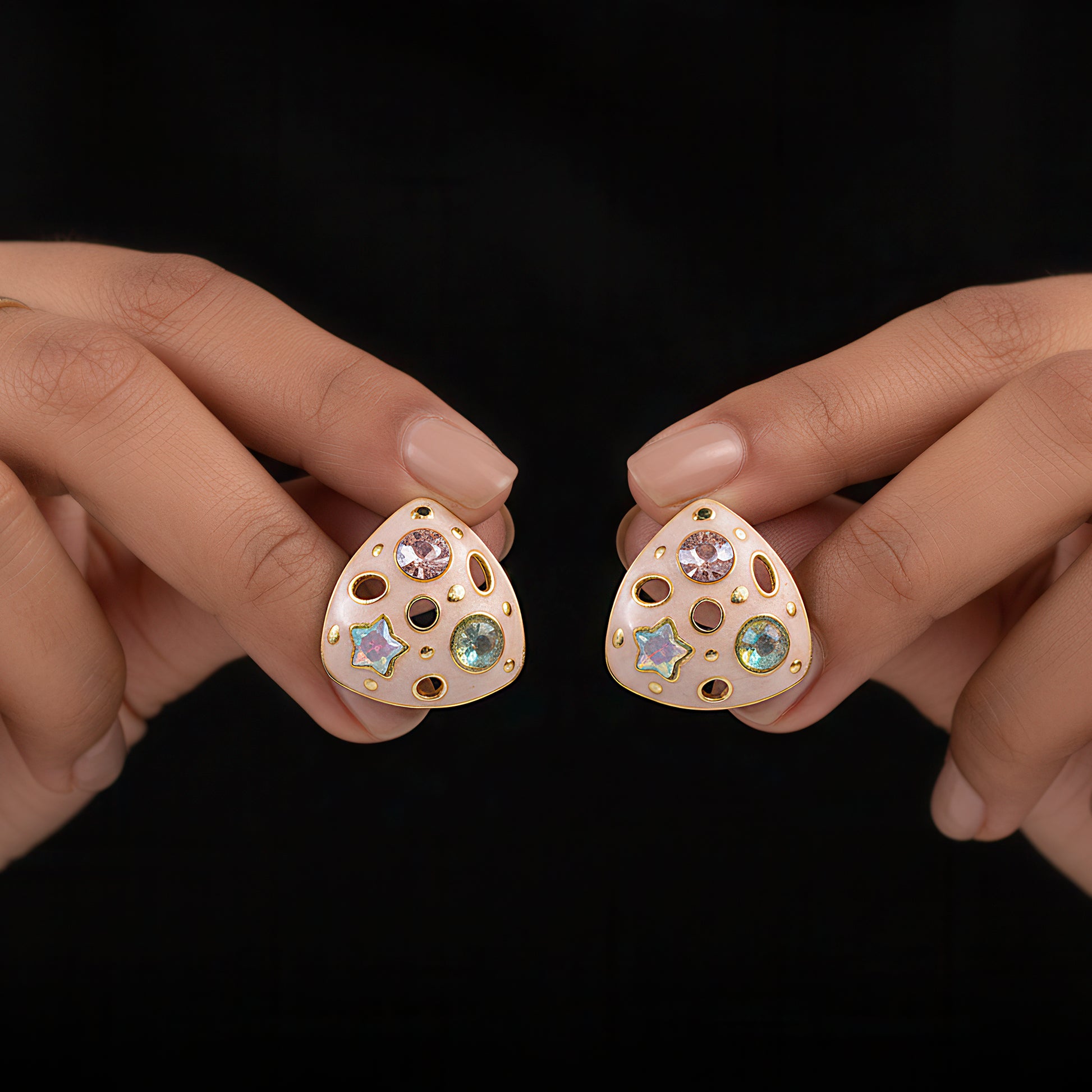 These triangle-shaped caps are stylish and modern, with a gorgeous combination of crystal shapes and soft peach enamel accents. The soft peach color lends a hint of coziness and refinement, while the geometric shape provides a striking, contemporary edge. Each earring is exquisitely adorned with a variety of crystals that reflect light to add a subtle glitter to their fashionable appeal. They provide the ideal amount of refinement and trendiness to your accessory collection while being lightweight and comfortable to wear. These earrings stand out thanks to their distinctive shape and elegant detailing, whether they are worn with a laid-back daytime ensemble or dressed up for an evening function. They are perfect for people who value simple yet striking jewelry since they give any outfit a dash of contemporary glitz.