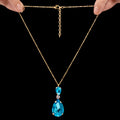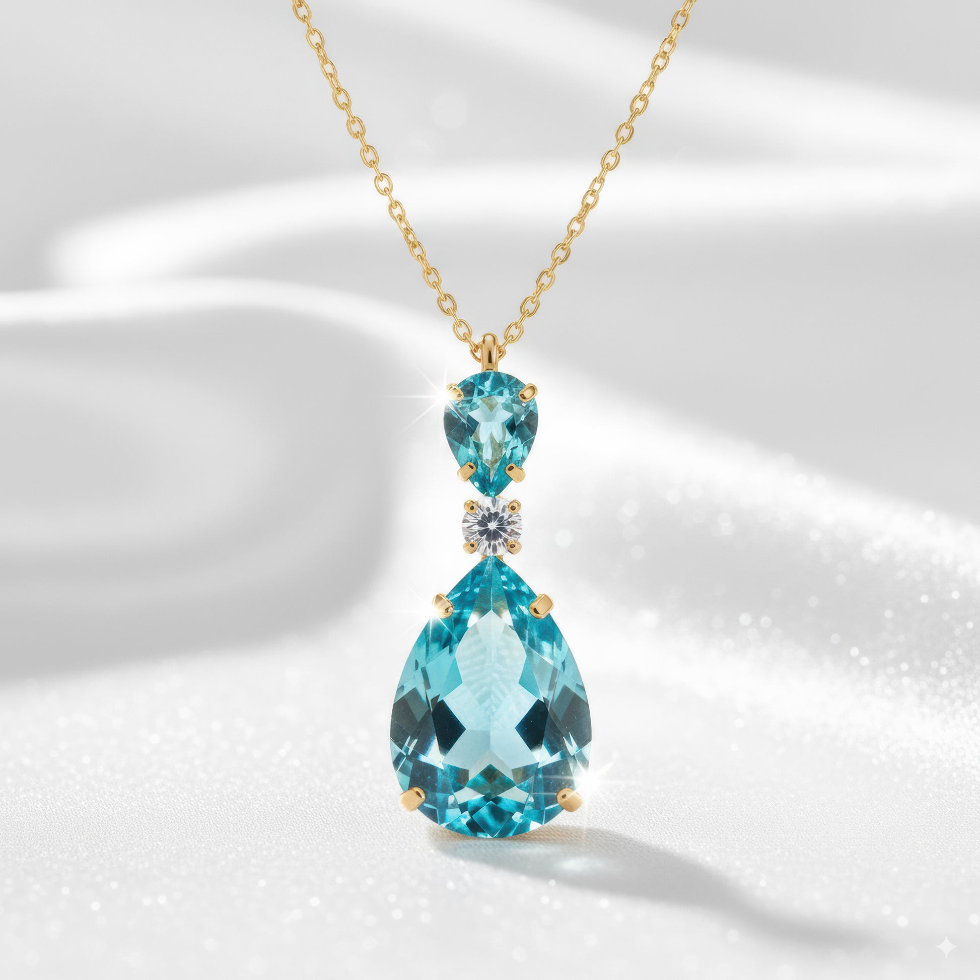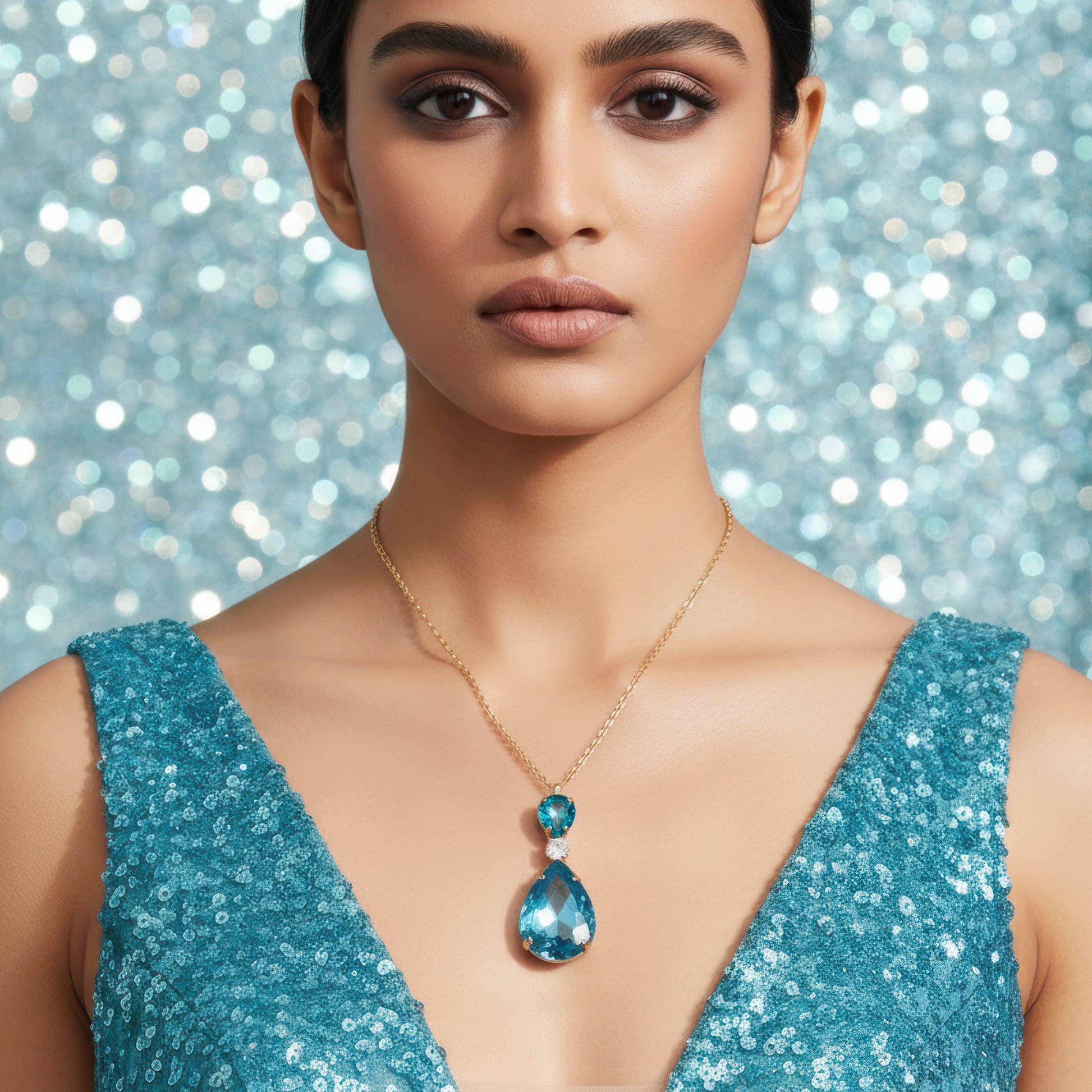 This necklace, which features stunning aquamarine drop gems that mimic the serene beauty of ocean waves, is delicate and revitalizing. It is the ideal accessory for both professional and informal settings because of the serene and elegant vibes that the gentle blue tones convey. The gems are expertly made and faceted to catch the light with every movement, giving your neckline a subtle shine. A stylish, adjustable chain that hangs the pendant guarantees a comfortable and attractive fit with any ensemble. This necklace offers a sophisticated and elegant touch of color to evening ensembles, summer dresses, and ethnic clothing. It is lightweight, comfortable to wear, and combines classic elegance with contemporary charm, making it the perfect addition to your jewelry collection or a thoughtful present for a particular someone.