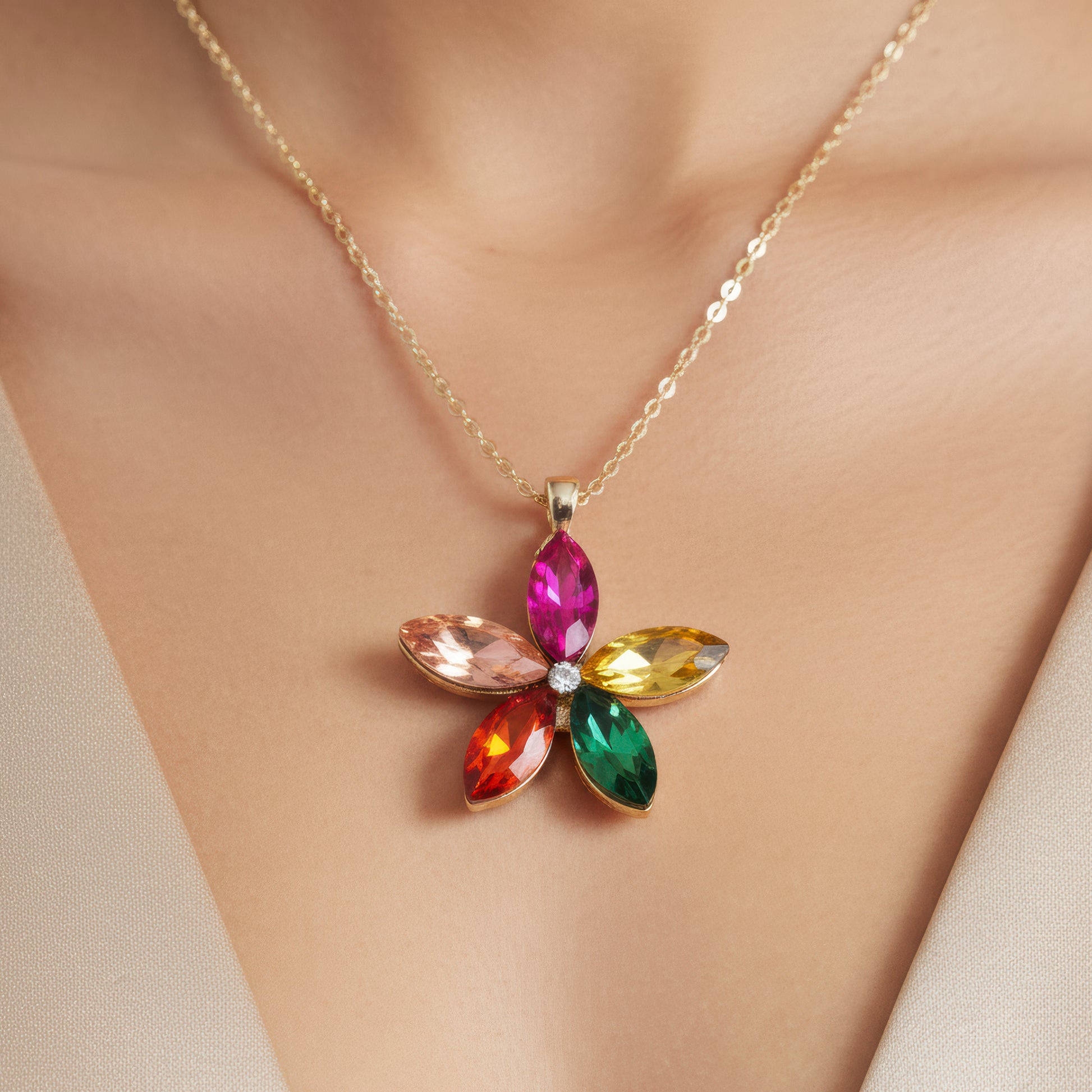 This necklace is vibrant and striking, with a lovely flower-shaped pendant set with multicolored crystals. Every petal explodes with brilliant colors, giving any ensemble an instant boost of fun and play. A stunning glitter that attracts attention without being overpowering is added by the finely set crystals, which are faceted to reflect light from all directions. The pendant, which is appropriate for both informal and celebratory settings, hangs from a sleek, flexible chain and rests elegantly and comfortably on the neckline. This necklace offers a playful yet sophisticated touch to your attire, whether it is worn alone or layered with other items. For people who enjoy distinctive and upbeat jewelry, this beautiful combination of color, originality, and charm is lightweight and comfortable to wear.