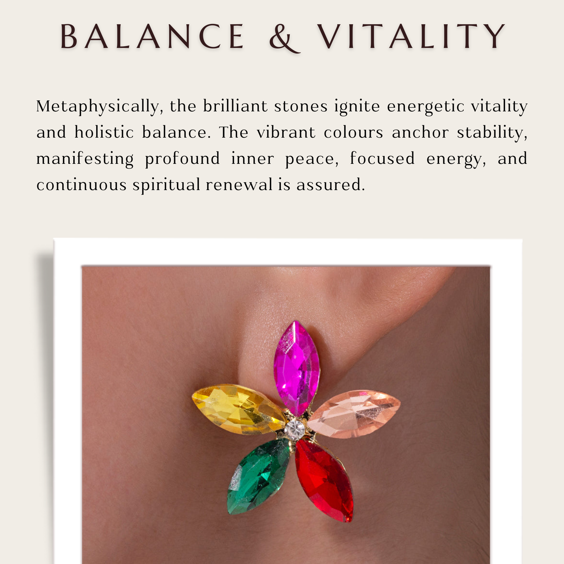 These earrings, which have a lovely flower design embellished with multicolored crystals that radiate lively charm, are playful and radiant. Every petal gleam with a distinct color, forming a vibrant and striking combination that infuses your design with enthusiasm and individuality. Every movement of the expertly set crystals adds a delicate yet alluring glitter since they are faceted to catch the light. These earrings are ideal for adding a colorful touch to celebratory occasions or enhancing casual ensembles because they are comfortable and lightweight enough to be worn all day. They are entertaining and adaptable due to their vibrant style, which makes them perfect for showing confidence and inventiveness. All ages and moods can benefit from the chic flash of color and touch of elegance that these floral earrings provide, whether they are worn alone or with complementary accessories.