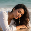 These sophisticated long dangling earrings blend a contemporary, delicate design with the depth of traditional craftsmanship. The piece is a lovely combination of glossy pearls and tiny Chinese-style beads that create a timeless, gentle charm. A beautifully crafted shell charm hangs elegantly at the bottom, adding a hint of coastal style and a distinctive focal point to the design. All-day comfort is guaranteed by the lightweight design, and they stand out for both special and casual settings because to the elaborate craftsmanship. These earrings, which combine cultural artistry and modern style, are ideal for creating a statement with evening wear or completing a stylish daily ensemble. They are a multipurpose and striking addition to any jewelry collection.