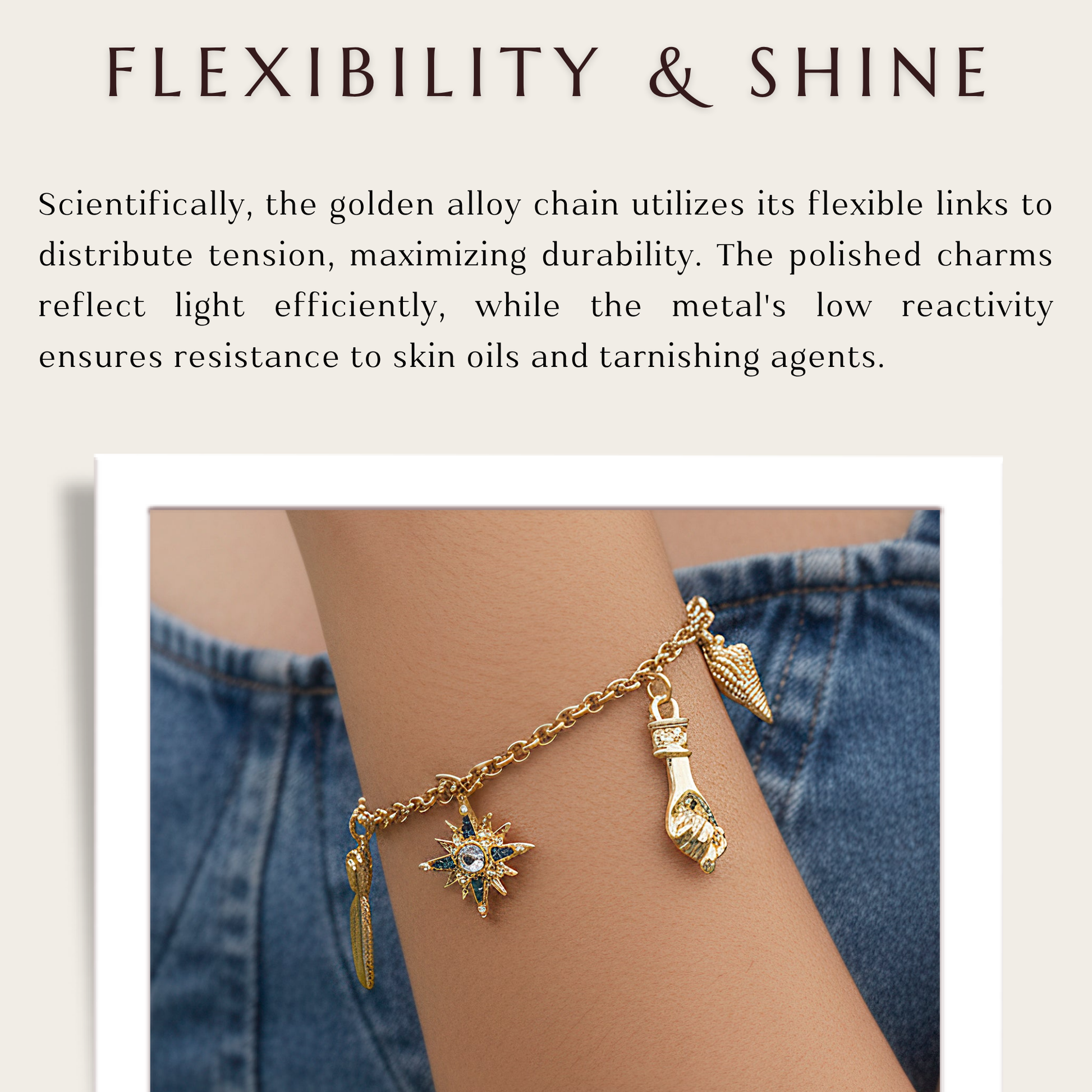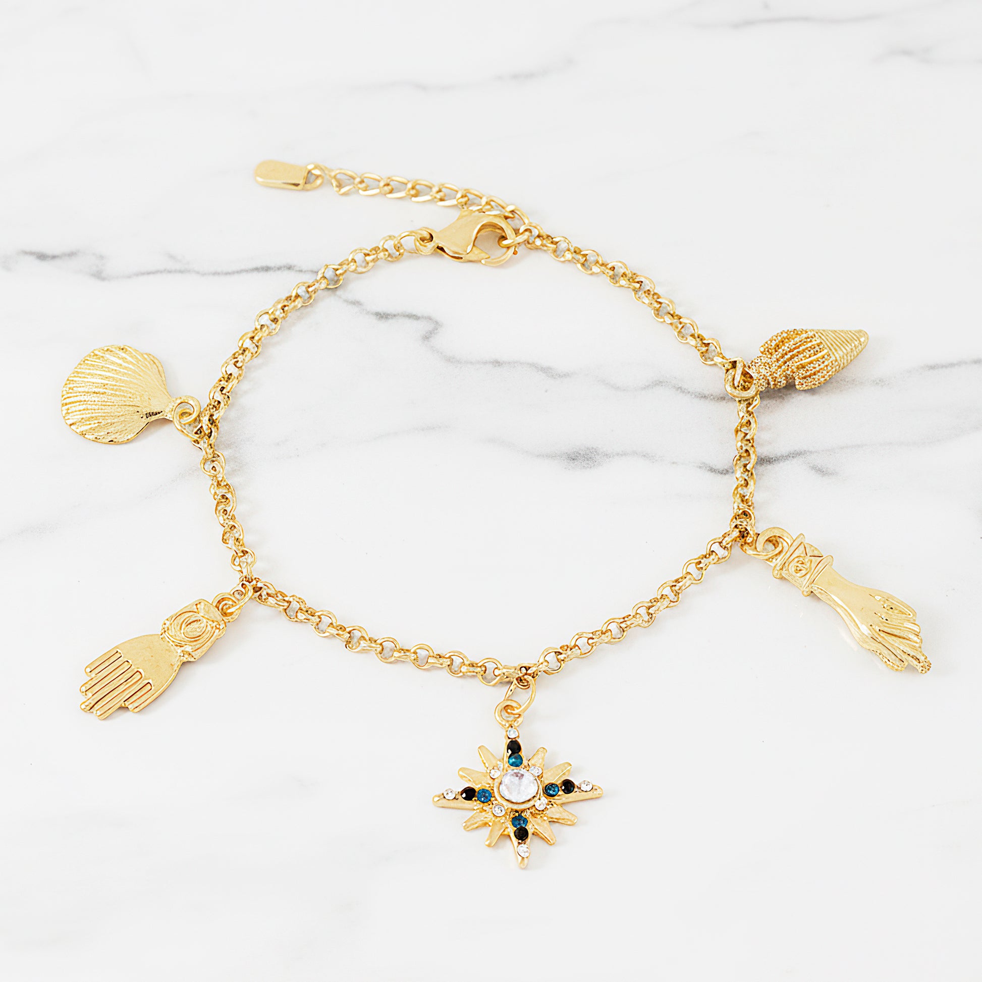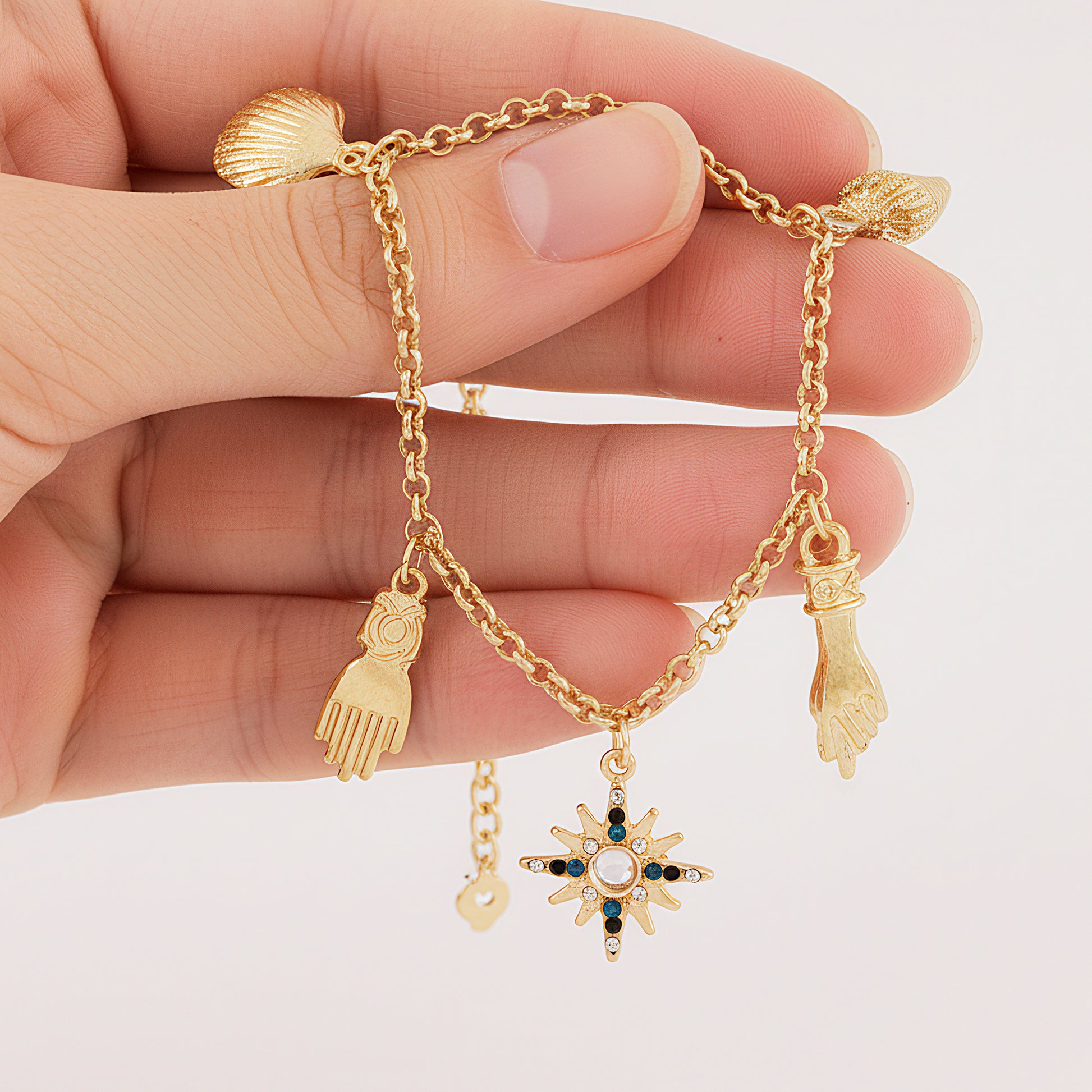 With its assortment of distinctive charms, this exquisitely designed chain bracelet exudes a sense of elegance and playfulness. It adds a light, seaside touch that is reminiscent of seashore getaways with its assortment of natural shells. The dazzling sun charm gives warmth and positivity to the design, while the intricately detailed hand charm adds an artistic and symbolic element. The blend of surfaces and textures produces a vibrant and striking appearance that goes well with both fancy and casual ensembles. The bracelet is lightweight, comfy, and has a solid fastening that keeps it in place while you move. Its adaptable design adds charm and individuality to any jewelry collection and is perfect for wearing alone as a standout piece or stacking with other bracelets.